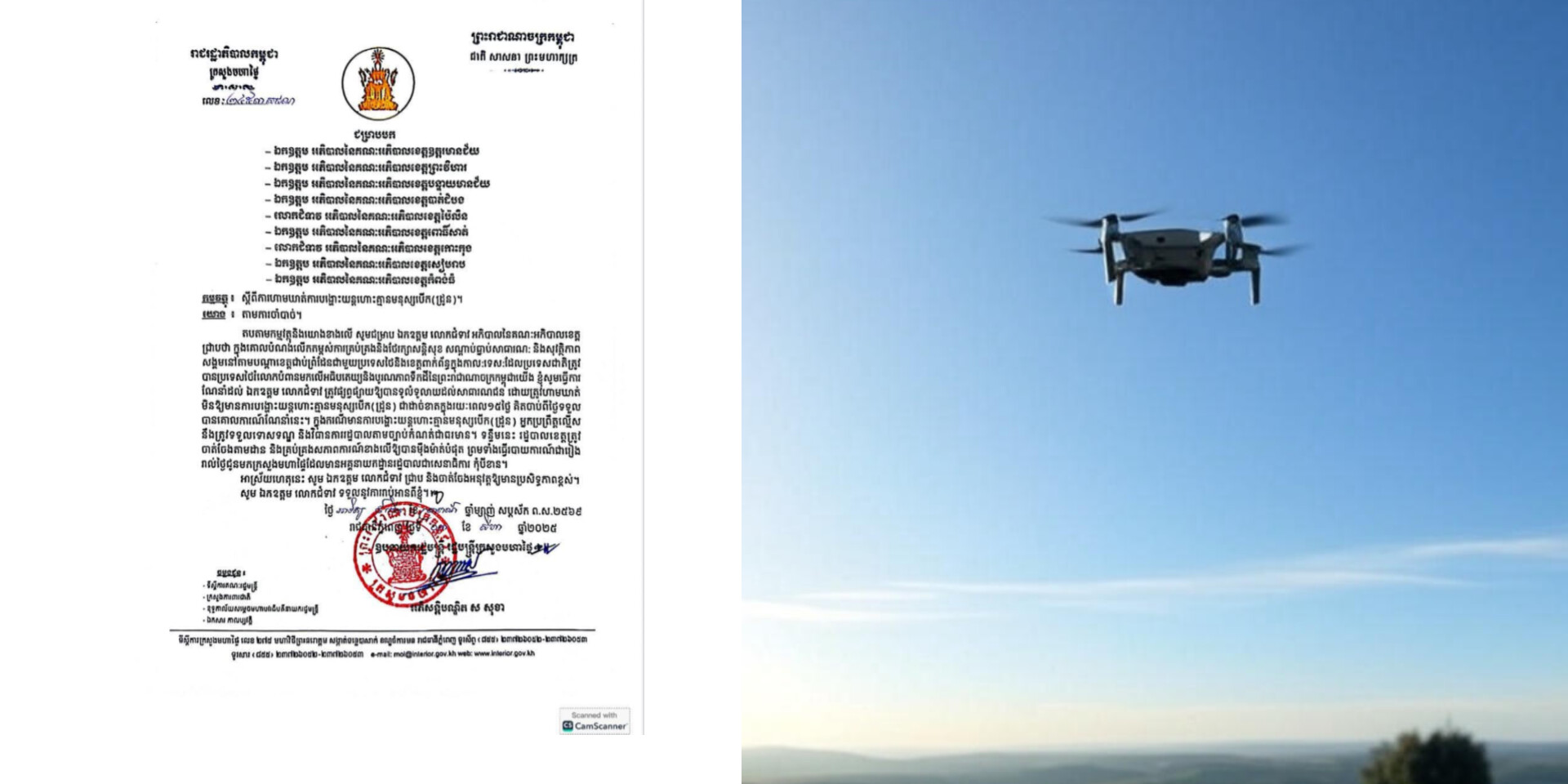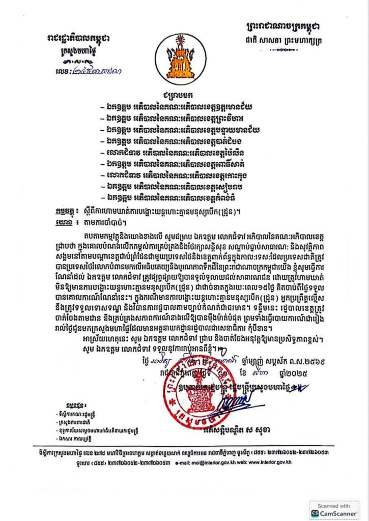 ឧបនាយករដ្ឋមន្ត្រី ស សុខា រដ្ឋមន្ត្រីក្រសួងមហាផ្ទៃ បានហាមមិនឱ្យមានបង្ហោះដ្រូន រយៈពេល១៥ថ្ងៃ គិតចាប់ពីថ្ងៃទី៣ ខែសីហា ឆ្នាំ២០២៥នេះតទៅ។