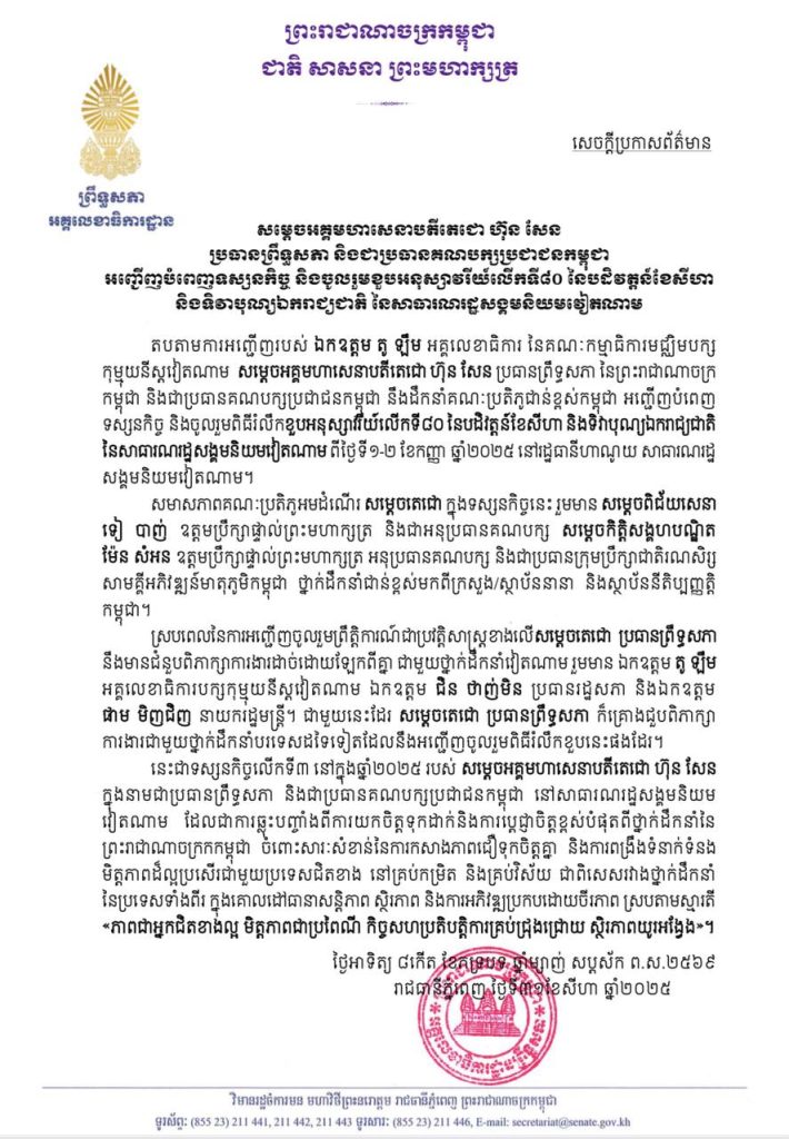 ភ្នំពេញ៖ តបតាមការអញ្ជើញរបស់ ឯកឧត្តម តូ ឡឹម អគ្គលេខាធិការ នៃគណៈកម្មាធិការមជ្ឈិមបក្សកុម្មុយនីស្តវៀតណាម, សម្តេចអគ្គមហាសេនាបតីតេជោ ហ៊ុន សែន ប្រធានព្រឹទ្ធសភាកម្ពុជា និងជាប្រធានគណបក្សប្រជាជនកម្ពុជា នឹងដឹកនាំគណៈប្រតិភូជាន់ខ្ពស់កម្ពុជា អញ្ជើញបំពេញទស្សនកិច្ច និងចូលរួមពិធីរំលឹកខួបអនុស្សាវរីយ៍លើកទី៨០ នៃបដិវត្តន៍ខែសីហា និងទិវាបុណ្យឯករាជ្យជាតិ នៃសាធារណរដ្ឋសង្គមនិយមវៀតណាម ពីថ្ងៃទី១-២ ខែកញ្ញា ឆ្នាំ២០២៥ នៅរដ្ឋធានីហាណូយ សាធារណរដ្ឋសង្គមនិយមវៀតណាម។