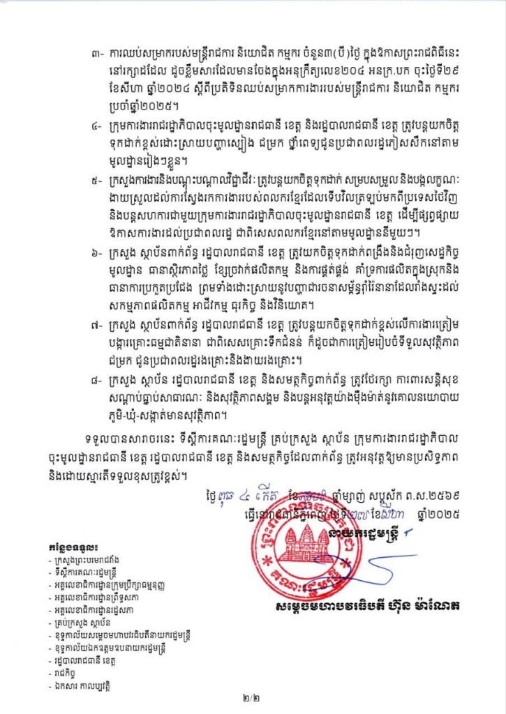 បច្ចុប្បន្ន ព្រះរាជាណាចក្រកម្ពុជាបាននិងកំពុងបន្តអនុវត្តបទឈប់បាញ់ដោយពេញលេញនិងម៉ឺងម៉ាត់ បំផុត ស្របតាមស្មារតីកិច្ចប្រជុំពិសេសដែលបានធ្វើឡើងនៅទីក្រុងគូឡាឡាំពួនៃប្រទេសម៉ាឡេស៊ី កាលពី ថ្ងៃទី២៨ ខែកក្កដា ឆ្នាំ២០២៥ ក្រោមកិច្ចសម្របសម្រួលដែលមានប្រទេសម៉ាឡេស៊ីធ្វើជាម្ចាស់ផ្ទះ និងជាសាក្សី សហរដ្ឋអាម៉េរិកជាសហអ្នករៀបចំ ដោយមានការចូលរួមពីតំណាងសាធារណរដ្ឋប្រជាមានិតចិន និងបណ្តាប្រទេស អាស៊ានជាអ្នកសង្កេតការណ៍។ ក្នុងស្មារតីនេះ និងដោយសាររាជរដ្ឋាភិបាលបាននិងកំពុងយកចិត្តទុកដាក់ខ្ពស់ លើស្ថានការណ៍ចំពោះមុខនៅតាមព្រំដែនកម្ពុជា-ថៃ ជាពិសេសការដោះស្រាយបញ្ហាជូនប្រជាពលរដ្ឋភៀសសឹក និងពលករខ្មែរធ្វើការនៅប្រទេសថៃដែលវិលត្រឡប់ចូលមកក្នុងប្រទេសកម្ពុជាវិញ រាជរដ្ឋាភិបាលសូមដាក់ចេញ នូវវិធានការណែនាំដូចខាងក្រោម៖