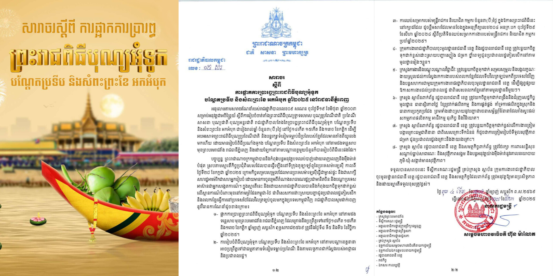 ១- ផ្អាកការប្រារព្ធព្រះរាជពិធីបុណ្យអុំទូក បណ្តែតប្រទីប និងសំពះព្រះខែ អកអំបុក នៅតាមដង ទន្លេសាប មុខព្រះបរមរាជវាំង រាជធានីភ្នំពេញ ដែលគ្រោងនឹងប្រព្រឹត្តទៅនៅថ្ងៃ១៤កើត ១៥កើត និង១រោច ខែកត្តិក ឆ្នាំម្សាញ់ សប្តស័ក ពុទ្ធសករាជ២៥៦៩ ត្រូវនឹងថ្ងៃទី៤ ទី៥ និងទី៦ ខែវិច្ឆិកា ឆ្នាំ២០២៥។
