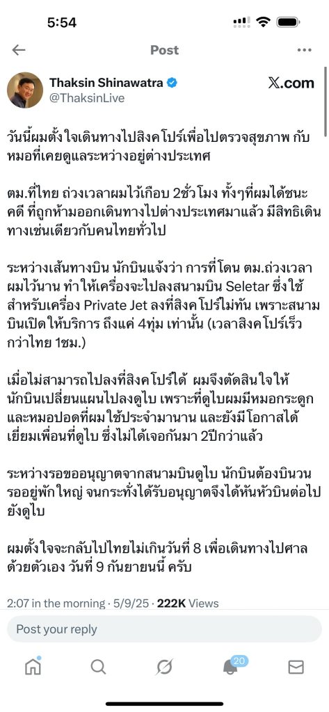 តាមរយៈបណ្តាញសង្គម Xលោក ថាក់ស៊ីន បានចេញបកស្រាយថា នៅពេលលោកចាកចេញពីប្រទេសថៃ ប៉ូលិសអន្តោប្រវេសន៍បានសាកសួរនាំអស់រយៈពេលប្រមាណ ២ម៉ោង ធ្វើឱ្យយន្តហោះលោកមិនអាចចុះចតនៅចំណតសម្រាប់យន្តហោះឯកជនប្រទេសសិង្ហបុរី ដែលគេបិទម៉ោង១០យប់ ។