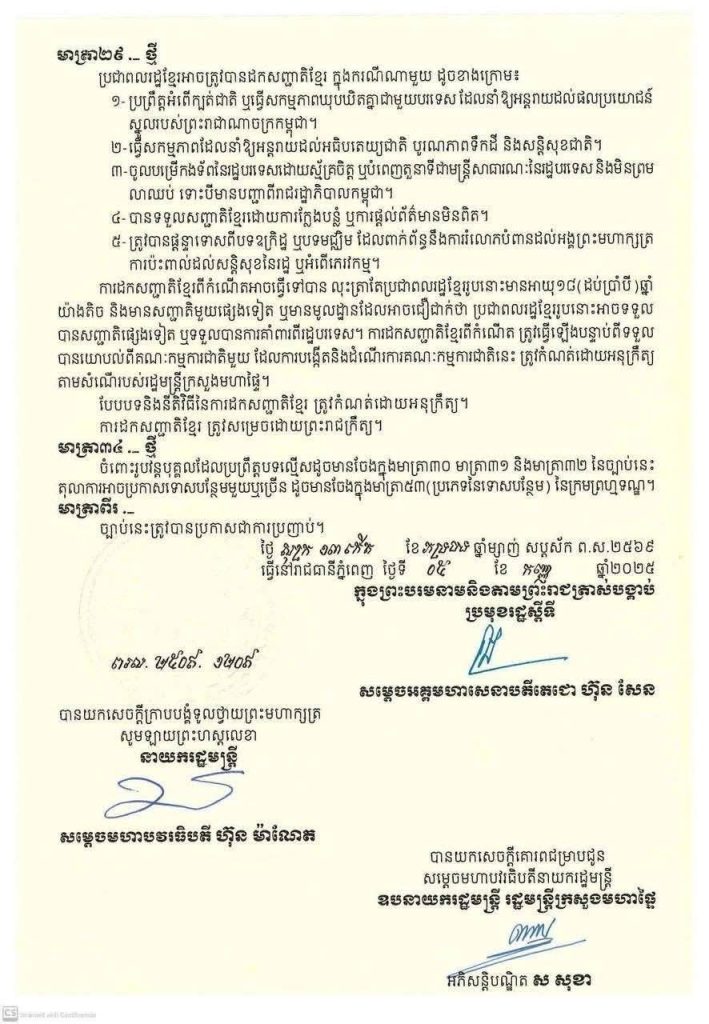 ព្រះរាជក្រម នស/រកម/០៩២៥/០៣០ ចុះថ្ងៃទី៥ ខែកញ្ញា ឆ្នាំ២០២៥ ប្រកាសឱ្យប្រើ ច្បាប់ស្តីពី វិសោធនកម្មច្បាប់ស្តីពីសញ្ជាតិ ដែលរដ្ឋសភាបានអនុម័តកាលពីថ្ងៃទី២៥ ខែសីហា ឆ្នាំ២០២៥ នាសម័យប្រជុំរដ្ឋសភាលើកទី៤ នីតិកាលទី៧ ហើយដែលព្រឹទ្ធសភាបានពិនិត្យសព្វគ្រប់លើទម្រង់និងគតិច្បាប់នេះទាំងស្រុងកាលពីថ្ងៃទី១ ខែកញ្ញា ឆ្នាំ២០២៥ នាសម័យប្រជុំព្រឹទ្ធសភាជាវិសាមញ្ញ នីតិកាលទី៥។
