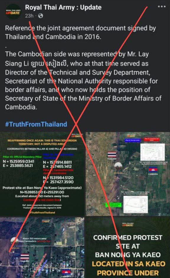ជាថ្មីម្តងទៀត រដ្ឋលេខាធិការដ្ឋានកិច្ចការព្រំដែន សូមប្រកាសបដិសេធ និងច្រានចោលទាំងស្រុង ចំពោះព័ត៌មានមិនពិត ក្លែងក្លាយ ដែលគណនី Facebook Page មានឈ្មោះ «Royal Thai Army: Update” បានបង្ហោះផ្សាយ និងសូមអំពាវ នាវដល់សាធារណជនជាតិ និងអន្តរ ជាតិទាំងអស់កុំជឿ និង កុំចែកចាយព័ត៌មានក្លែង ក្លាយទាំងនេះ ហើយរដ្ឋលេខាធិការដ្ឋានកិច្ចការព្រំដែនសូមលើកទឹកចិត្តឱ្យមានការផ្សព្វ ផ្សាយ និងចែកចាយសេចក្តីប្រកាស បដិ សេធព័ត៌មាននេះ ឱ្យបានទូលំទូលាយដើម្បីឱ្យមហាជន បានជ្រួតជ្រាបអំពីការពិតលើបញ្ហានេះ។