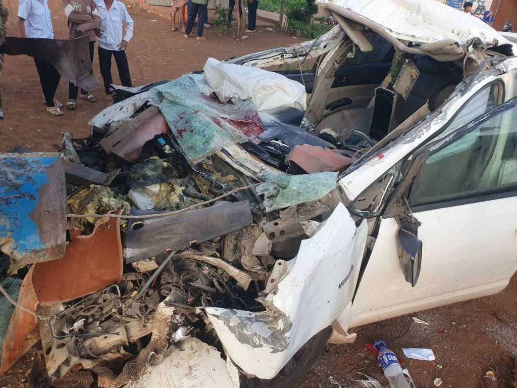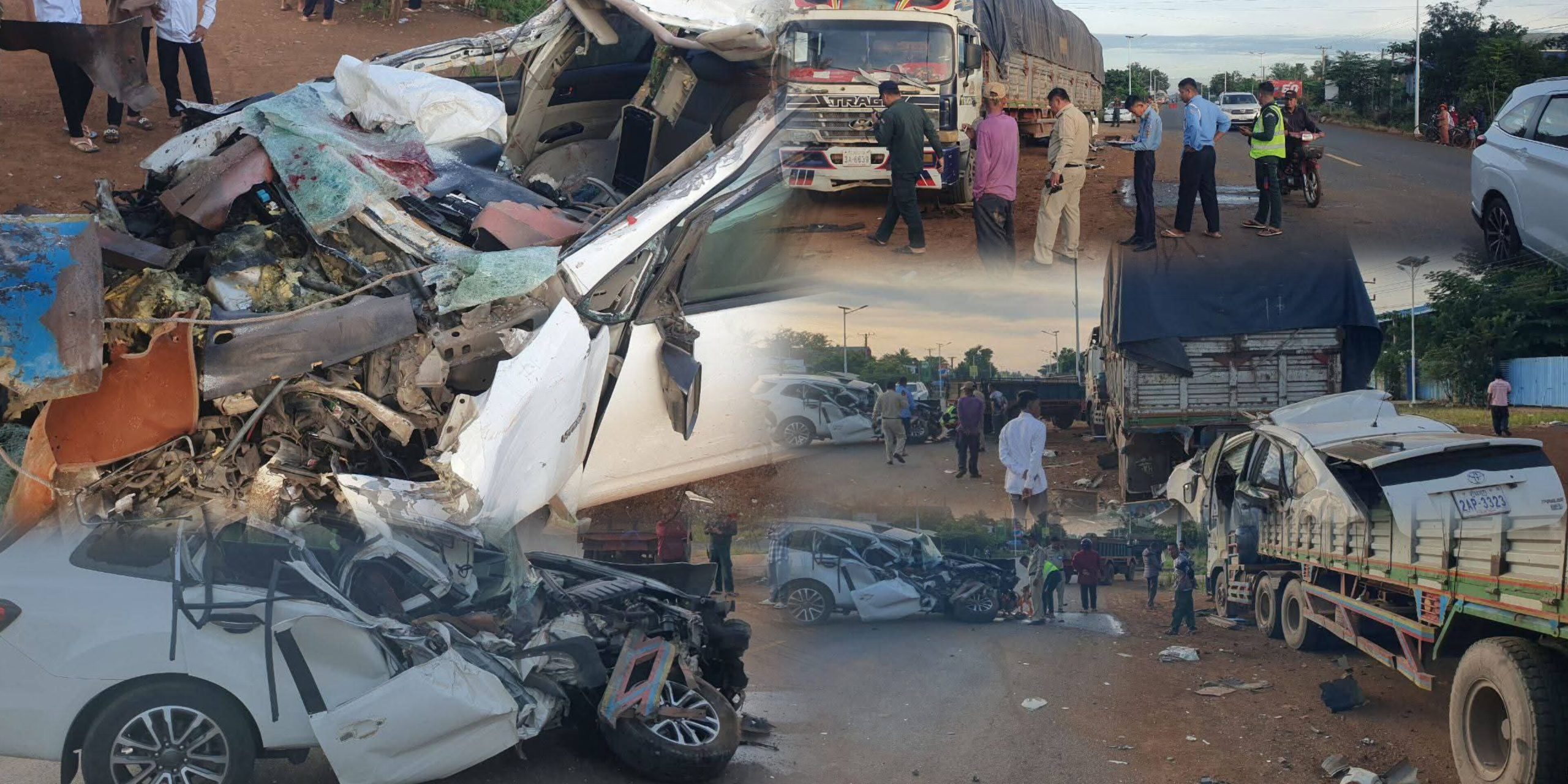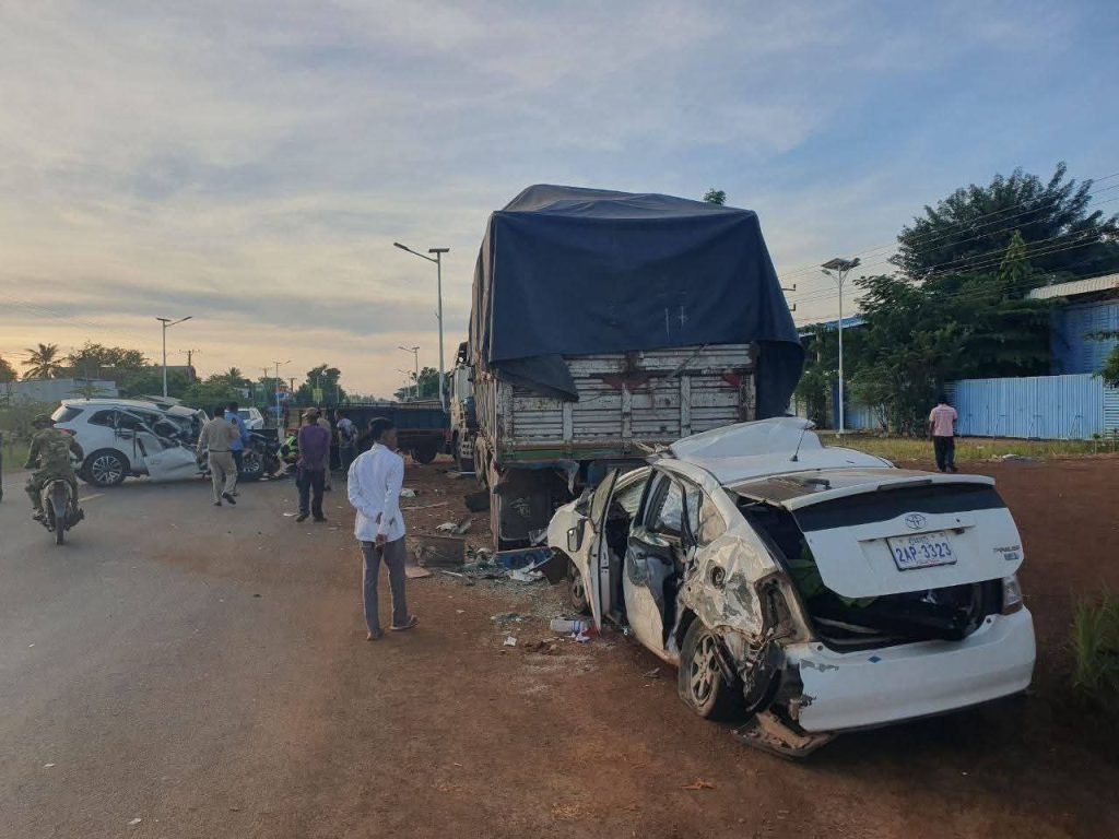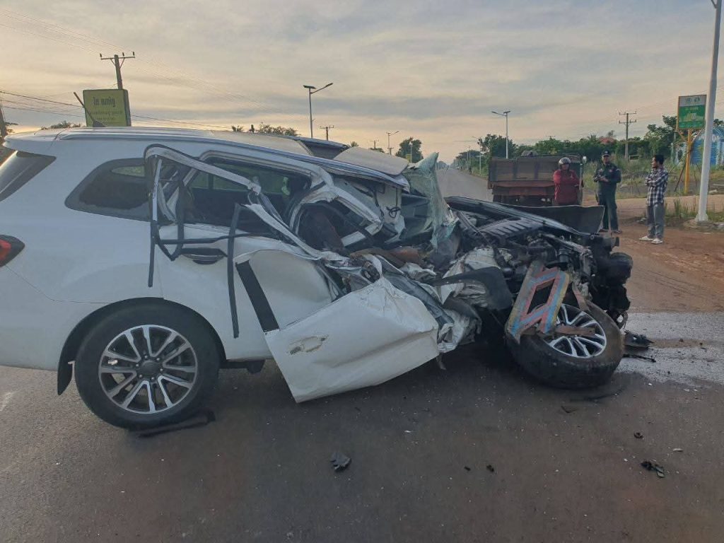 រថយន្ត Toyota Prius ខូចធ្ងន់ខ្ទេចផ្នែកខាងមុខទាំងស្រុងរថយន្ត Avanza ខូចធ្ងន់ផ្នែកខាងមុខ រថយន្តយីឌុបដឹកស្រូវត្រូវរងការខូចខាតផងដែរ។