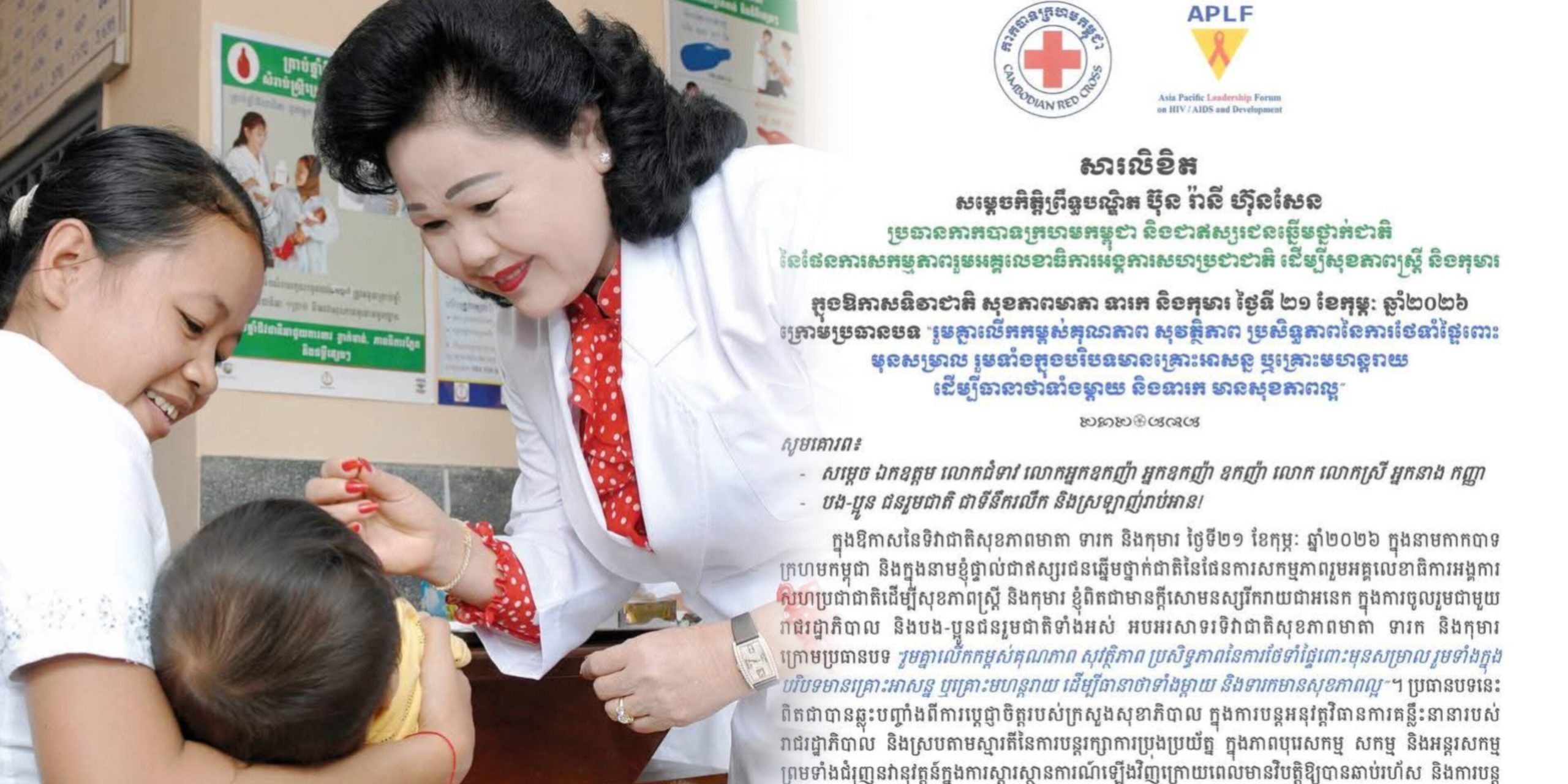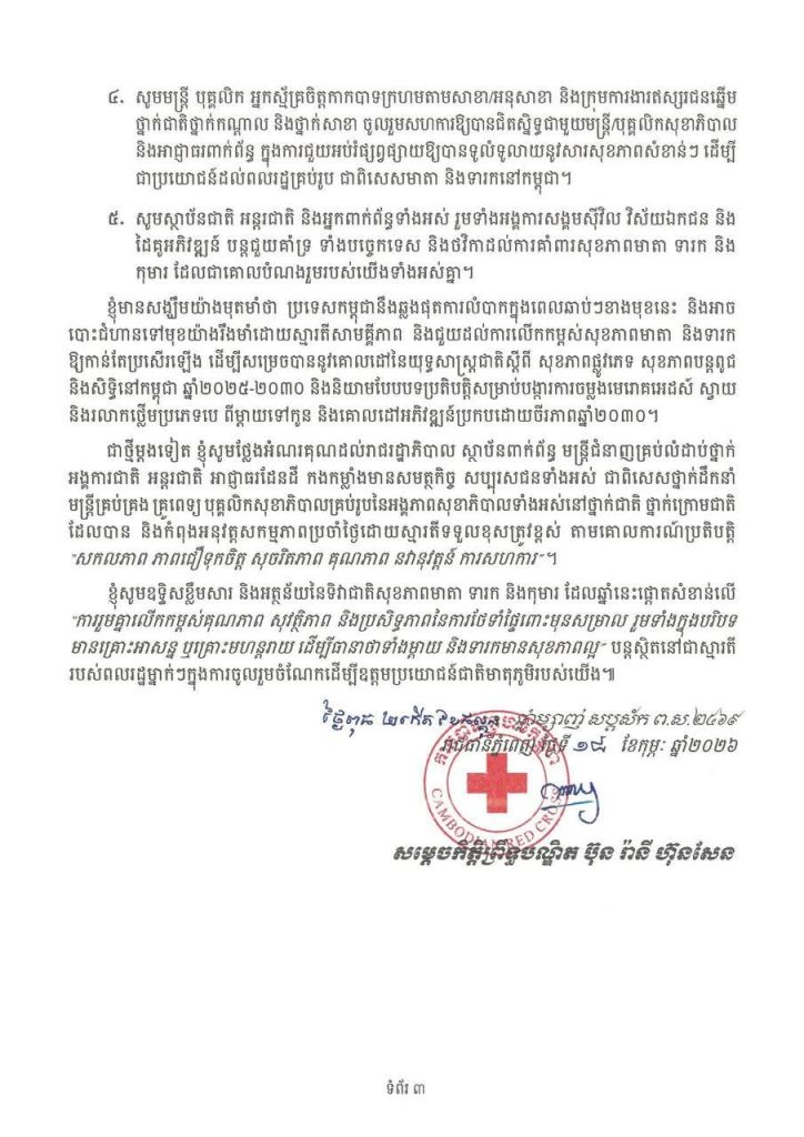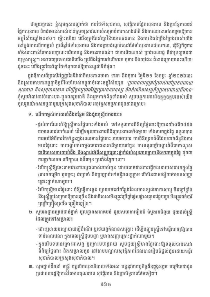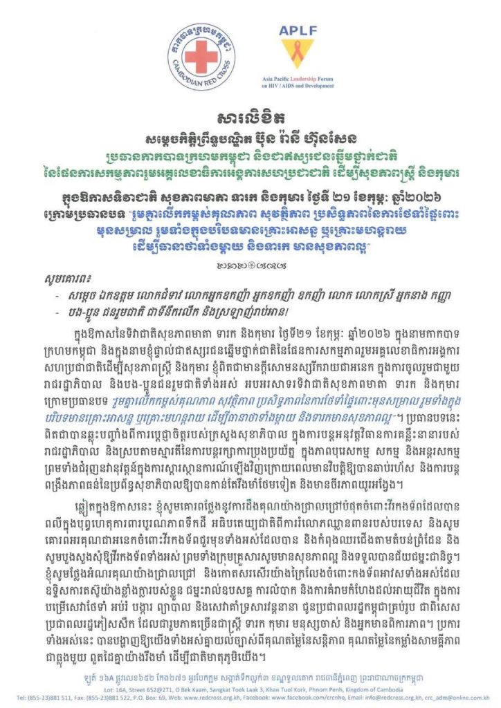 សម្តេចកិត្តិព្រឹទ្ធបណ្ឌិត ប៊ុន រ៉ានី ហ៊ុនសែន ប្រធានកាកបាទក្រហមកម្ពុជា និងជាឥស្សរជនឆ្នើមថ្នាក់ជាតិ នៃផែនការសកម្មភាពរួមអគ្គលេខាធិការអង្គការសហប្រជាជាតិ ដើម្បីសុខភាពស្រ្តី និងកុមារ ចេញសារលិខិតផ្ញើជូនបងប្អូនជនរួមជាតិ ក្នុងឱកាសទិវាជាតិ សុខភាពមាតា ទារក និងកុមារ ថ្ងៃទី ២១ ខែកុម្ភៈ ឆ្នាំ២០២៦ ក្រោមប្រធានបទ «រួមគ្នាលើកកម្ពស់គុណភាព សុវត្ថិភាព ប្រសិទ្ធភាពនៃការថែទាំផ្ទៃពោះមុនសម្រាល រួមទាំងក្នុងបរិបទមានគ្រោះអាសន្ន ឬគ្រោះមហន្តរាយដើម្បីធានាថាទាំងម្តាយ និងទារក មានសុខភាពល្អ»។