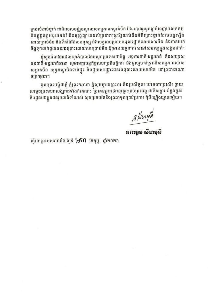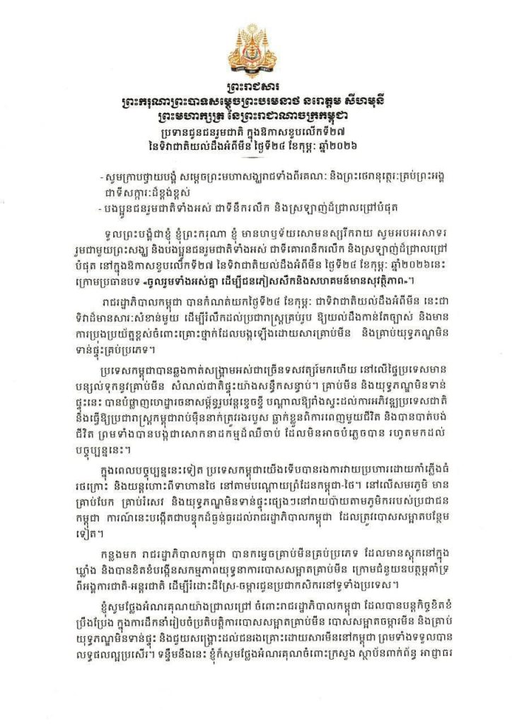 ព្រះរាជសារ ព្រះករុណាជាអម្ចាស់ជីវិតលើត្បូង ព្រះមហាក្សត្រនៃព្រះរាជាណាចក្រកម្ពុជា ប្រទឆនជូនជនរួមជាតិ ក្នុងឱកាសប្រារព្ធខួបលើកទី២៧ នៃទិវាជាតិយល់ដឹងអំពីមីន ២៤កុម្ភៈ ២០២៦