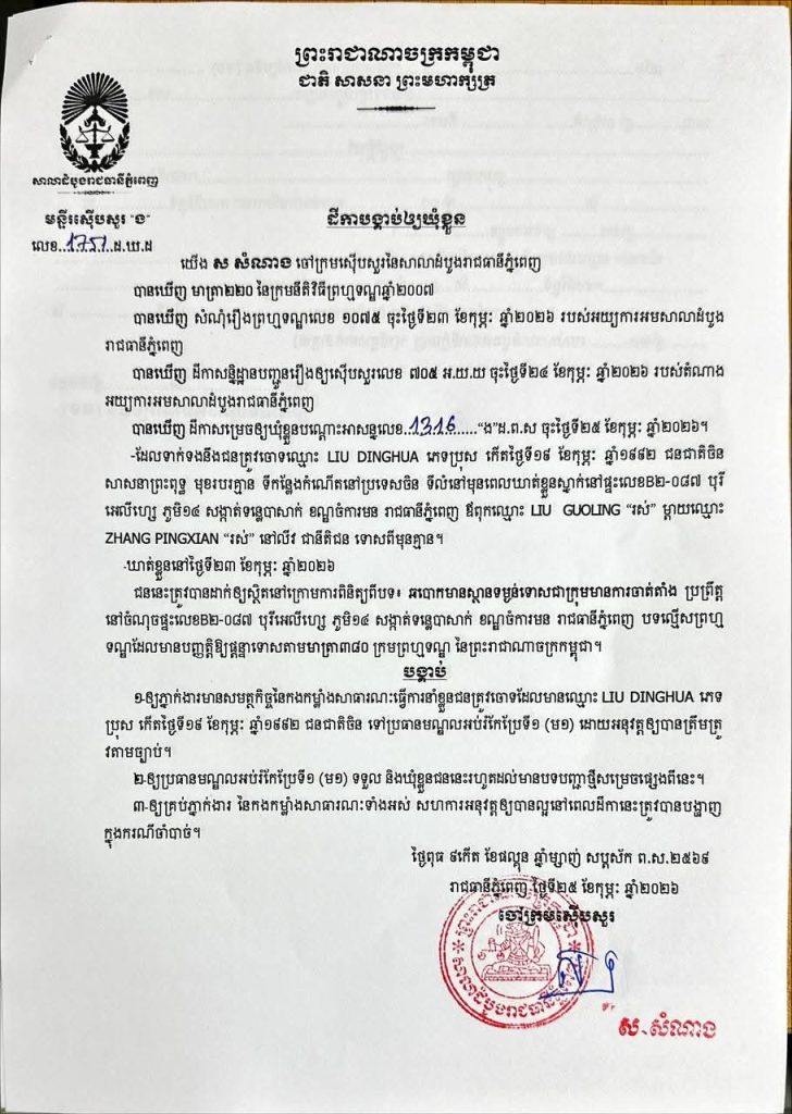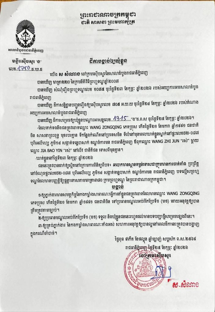 ភ្នំពេញ៖កាលពីថ្ងៃទី២៧ ខែកុម្ភៈ ឆ្នាំ២០២៦ លោក ស សំណាង ចៅក្រមស៊ើបសួរនៃសាលាដំបូងរាជធានីភ្នំពេញ បានចេញដីកាឃុំខ្លួនបណ្តោះអាសន្នលើបុរសជនជាតិចិនចំនួន២នាក់ ពាក់ព័ន្ធនឹងបទល្មើសឆបោកមានស្ថានទម្ងន់ទោស ជាក្រុមមានការចាត់តាំងប្រព្រឹត្តនៅក្នុងរាជធានីភ្នំពេញ។