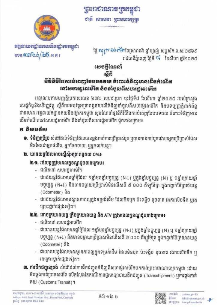 ជាក់ស្តែងការនាំចូលរថយន្តមកពីអាមេរិក ដែលអាចស្នើសុំអត្រាពន្ធគយ ០%បាន ត្រូវគោរពលក្ខខណ្ឌដូចជា៖