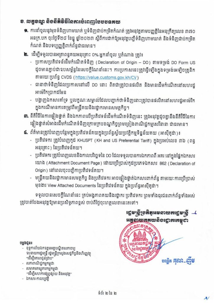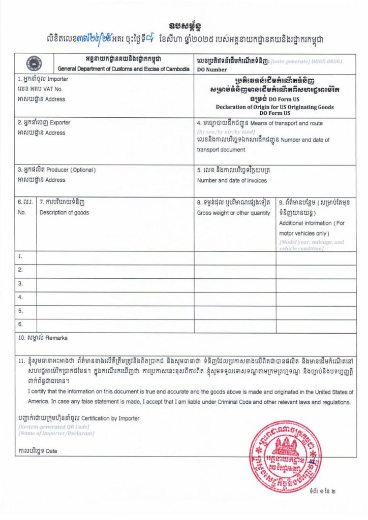 ភ្នំពេញ៖ រាជរដ្ឋាភិបាលកម្ពុជា បានម្រេចដាក់ឱ្យអនុវត្តអត្រាពន្ធគយ០% ចំពោះមុខទំនិញដែលមានដើមកំណើតនៅសហរដ្ឋអាម៉េរិក ហើយនាំចូលមកកម្ពុជា លើកលែងតែទំនិញដែលប្រើប្រាស់រួច។ យ៉ាងនេះក្តីក៏មានលក្ខខណ្ឌតម្រូវមួយចំនួនអ្នកនាំចូលត្រូវឈ្វេងយល់ ដើម្បីទទួលបានអត្រាពន្ធគយអនុគ្រោះ០% នេះ។