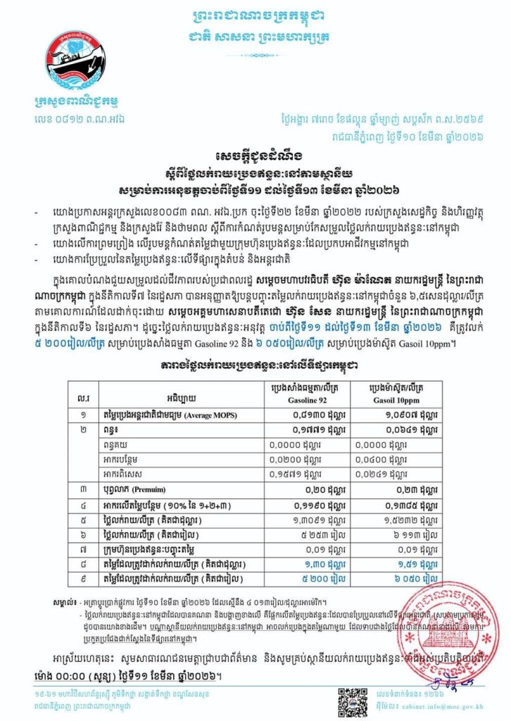 ភ្នំពេញ៖ ក្រសួងពាណិជ្ជកម្មបានចេញសេចក្តីជូនដំណឹងស្តីពីថ្លៃលក់រាយប្រេងឥន្ធនៈនៅតាមស្ថានីយសម្រាប់ការអនុវត្តចាប់ពីម៉ោង ០០:០០ ថ្ងៃទី១១ ដល់ថ្ងៃទី១៣ ខែមីនា ឆ្នាំ២០២៦។