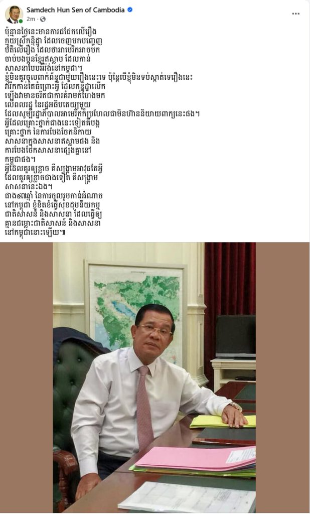ភ្នំពេញ៖ សម្តេចតេជោ ហ៊ុន សែន ប្រមុខរដ្ឋស្តីទី បានចេញសារទប់ស្កាត់ផលប៉ះពាល់ពីការលើកឡើងរបស់អ្នកនាង កន្និដ្ឋា ដែលថា អាមេរិកអាចមកចាប់បងប្អូនខ្មែរឥស្លាម ដែលកាន់សាសនាបែបអ៉ីរ៉ង់នៅកម្ពុជា។