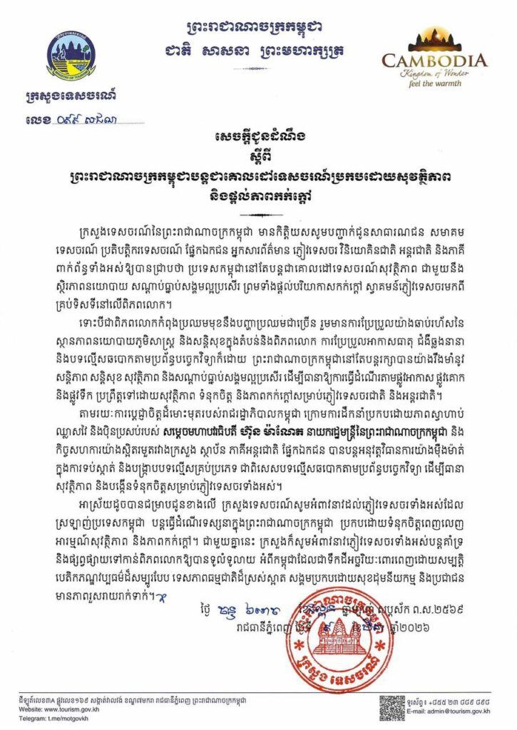 ភ្នំពេញ ៖ ក្រសួងទេសចរណ៍បានបញ្ជាក់ជាថ្មីថា ព្រះរាជាណាចក្រកម្ពុជានៅតែបន្តជាគោលដៅទេសចរណ៍ដែលមានសុវត្ថិភាព និងផ្តល់បរិយា កាសកក់ក្តៅស្វាគមន៍ភ្ញៀវទេសចរជាតិ និងអន្តរ ជាតិ ទោះបីជាពិភពលោកកំពុងប្រឈមនឹងបញ្ហាប្រឈមជាច្រើនក៏ដោយ។