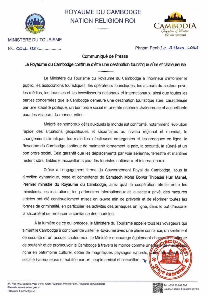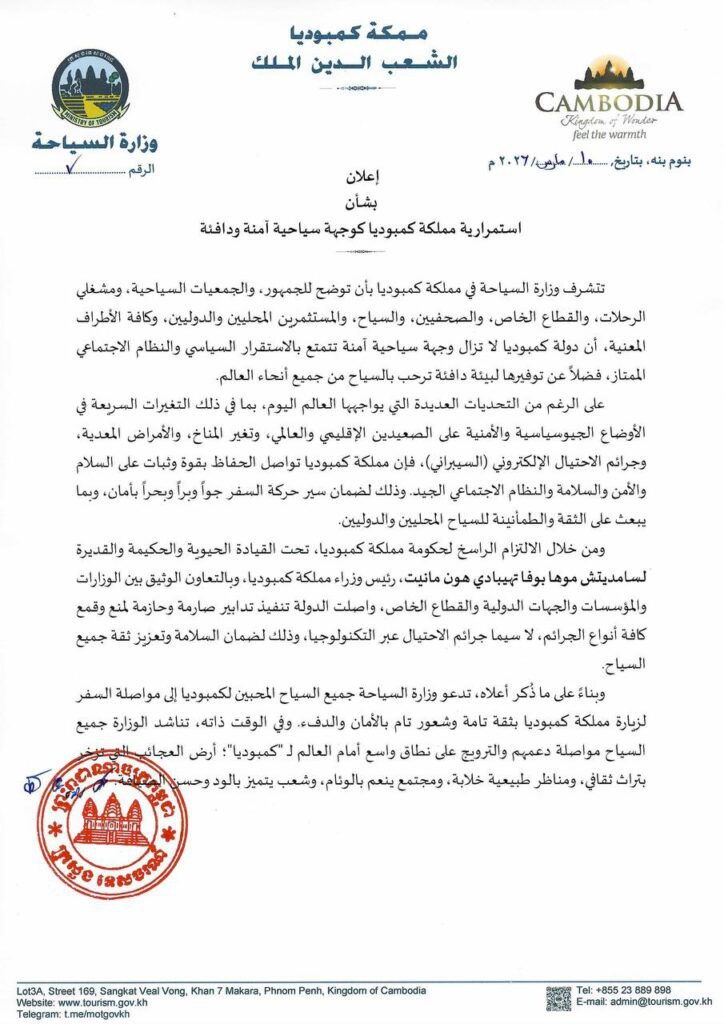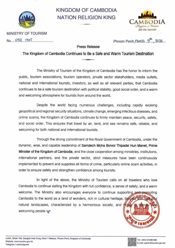យោងតាមសេចក្តីជូនដំណឹងរបស់ក្រសួងទេស ចរណ៍ ដែលចេញផ្សាយកាលពីថ្ងៃទី១១ ខែមីនា ឆ្នាំ២០២៦ ប្រទេសកម្ពុជារក្សាបានស្ថិរភាពនយោ បាយ សណ្តាប់ធ្នាប់សង្គមល្អប្រសើរ និងសន្តិសុខរឹងមាំ ដែលធានាឱ្យការធ្វើដំណើរតាមផ្លូវអាកាស ផ្លូវគោក និងផ្លូវទឹក ប្រព្រឹត្តទៅដោយសុវត្ថិភាព ទំនុកចិត្ត និងភាពផាសុកភាព។
