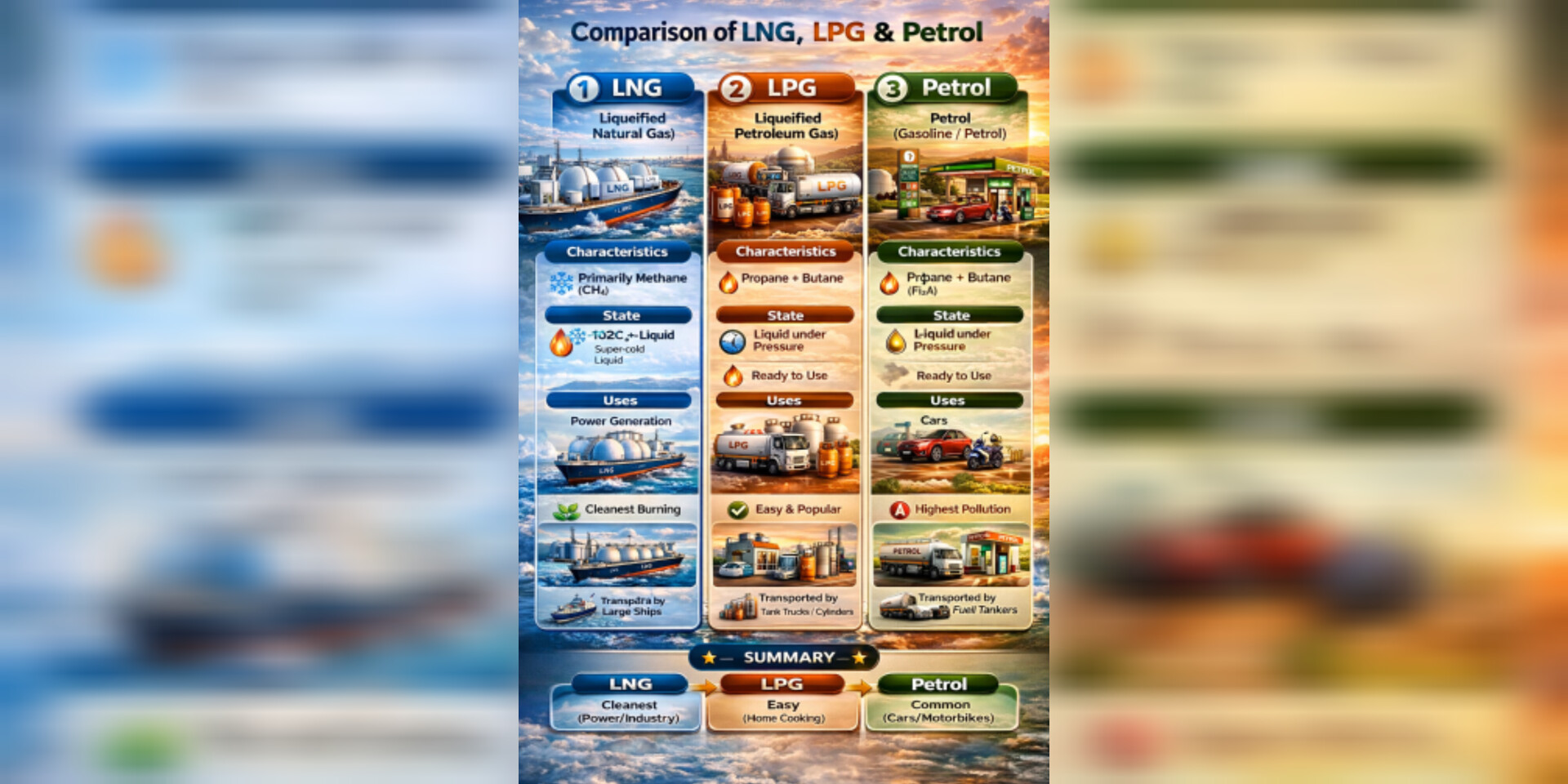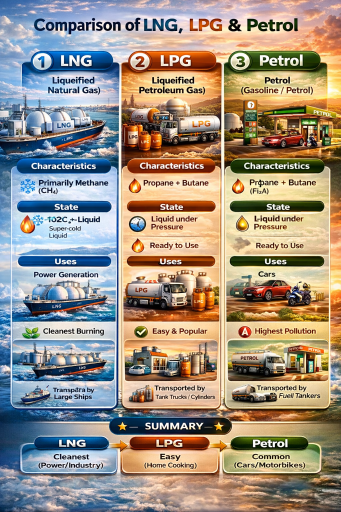 ភាពខុសគ្នារវាងឧស្ម័នធម្មជាតិរាវ (LNG), ឧស្ម័នឥន្ធនៈរាវ (LPG) និងប្រេងឥន្ធនៈ (Petrol) ៖