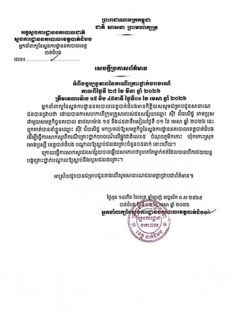 អ្នកនាំពាក្យ នៃស្នងការដ្ឋាននគរបាលខេត្តបាត់ដំបង បានបញ្ជាក់ថា ដោយបានការសហការពីក្រុមគ្រួសាររបស់ជនសង្ស័យឈ្មោះ ស៊ីវ ជ័យសិដ្ឋ ភេទប្រុស ជាមួយសមត្ថកិច្ចនគរបាល នាវេលាម៉ោង ១៥៖៤៥នាទីរសៀលថ្ងៃទី១ ខែមេសា ឆ្នាំ២០២៦នេះ ពួកគាត់បាននាំខ្លួនឈ្មោះ ស៊ីវ ជ័យសិដ្ឋ មកប្រគល់ឲ្យសមត្ថកិច្ច នៃស្នងការដ្ឋាននគរបាលខេត្តបាត់ដំបង ដើម្បីធ្វើការសាកសួរពីករណីគ្រោះថ្នាក់ចរាចរណ៍លើផ្លូវជាតិលេខ៥ ចំណុចភូមិកកោះ ឃុំកកោះ ស្រុក មោងឫស្សី ខេត្តបាត់ដំបង បណ្ដាលឲ្យស្លាប់ជនរងគ្រោះចំនួន៥នាក់ (ស្ដ្រីពោះធំម្នាក់) នោះហើយ។