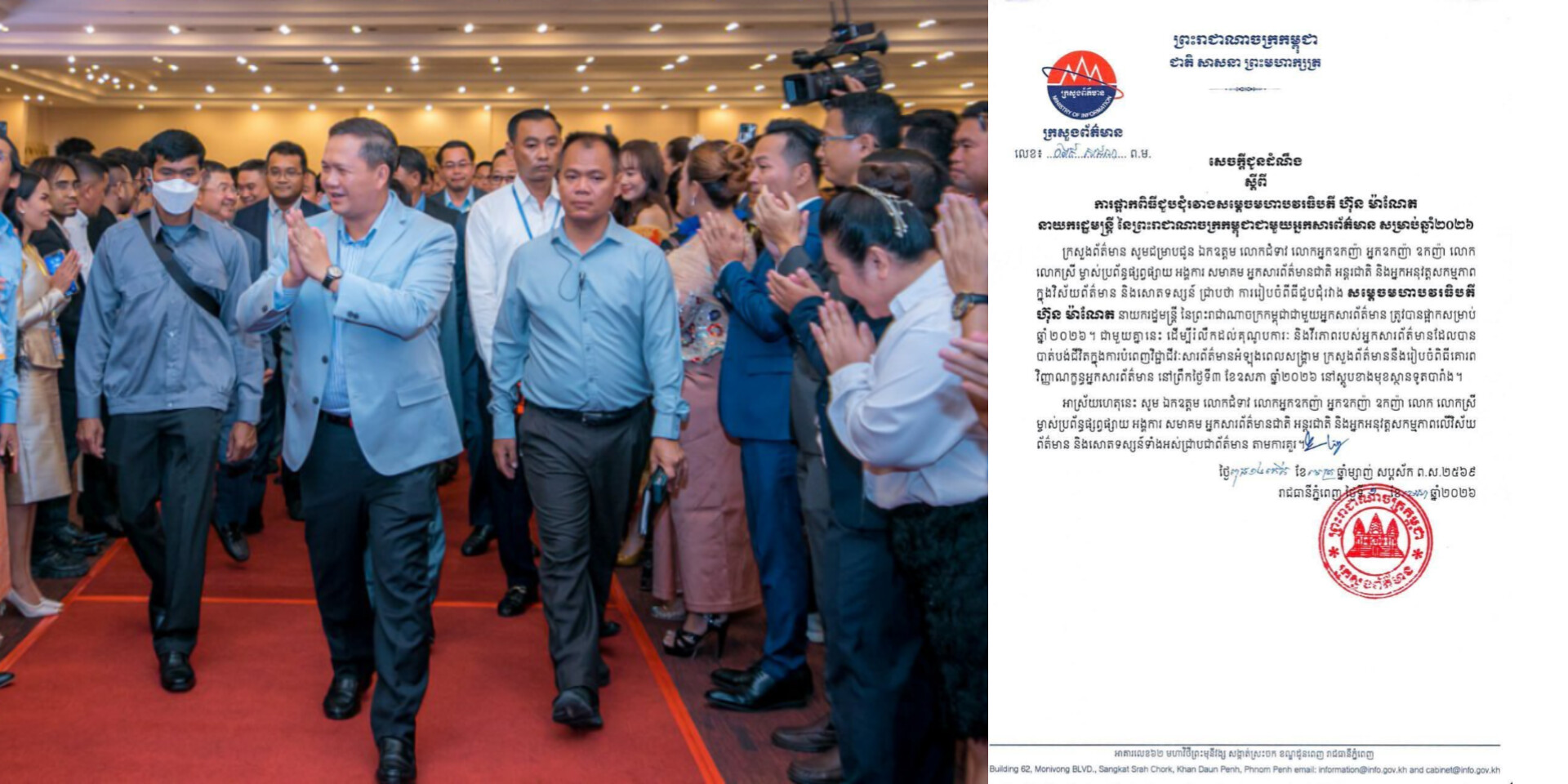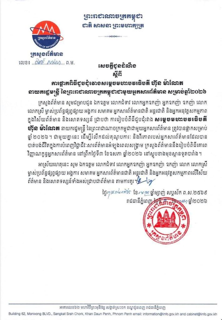 ភ្នំពេញ៖ ក្រសួងព័ត៌មាន បានប្រកាសជូនដំណឹងនៅថ្ងៃទី២ ខែមេសានេះថា ការរៀបចំពីធីជួបជុំរវាងសម្តេចមហាបវរធិបតី ហ៊ុន ម៉ាណែត នាយករដ្ឋមន្ត្រី ជាមួយអ្នកសារព័ត៌មាន ត្រូវបានផ្អាកសម្រាប់ ឆ្នាំ២០២៦នេះ។