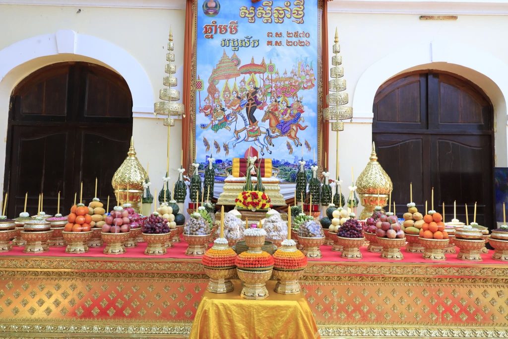 ពិធីនេះផងដែរបានធ្វើឡើងទៅតាមប្រពៃណីទំនៀមទំលាប់ ដែលប្រជាពលរដ្ឋគ្រប់លំនៅដ្ឋាន អង្គភាព ស្ថាប័ន សាលារៀន ក្រុមហ៊ុនទាំងរដ្ឋ និងឯកជន សុទ្ធតែបានរៀបចំគ្រឿងសក្ការៈបូជា ផ្លែឈើ ផ្កាភ្ញី គ្រឿងក្រអូប សម្រា ប់ទទួលទេវតាឆ្នាំថ្មី ព្រះនាម «រាក្យសាទេវី» ដែលចុះមកឃុំគ្រងដែនជម្ពូរទ្វីប ជំនួសទេវតាឆ្នាំចាស់ ទៅតាមប្រពៃណីទំនៀមទំលាប់ខ្មែរ។