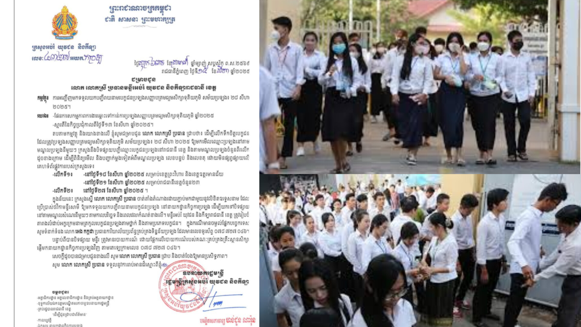 ក្រសងបញ្ជាក់ថា ដើម្បីលើកទឹកចិត្តបេក្ខជន ដែលត្រូវប្រឡងសញ្ញាបត្រមធ្យមសិក្សាទុតិយភូមិ សម័យប្រឡង៖ ២៨ សីហា ២០២៥ ឱ្យមកមើលឈ្មោះប្រឡងនៅតាម មណ្ឌលប្រឡងនីមួយៗ ក្រសួងនឹងបិទផ្សាយបញ្ជីឈ្មោះបេក្ខជនប្រឡងនៅរាជធានី ខេត្ត និងតាមមណ្ឌលប្រឡងចំនួនពីរលើក៖