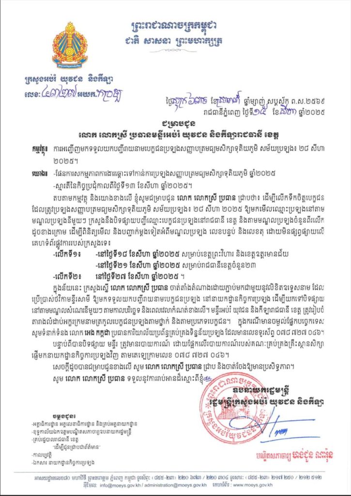 ភ្នំពេញ៖ ក្រសួងអប់រំ យុវជន និងកីឡា បានចេញសេចក្តីជូនដំណឹង ពីការបិទផ្សាយឈ្មោះបេក្ខជនប្រឡងសញ្ញាបត្រមធ្យមសិក្សាទុតិយភូមិ សម័យប្រឡង៖ ២៨ សីហា ២០២៥។