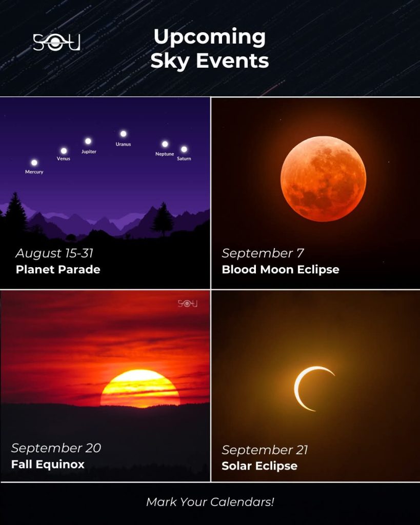 ថ្ងៃទី 15-31 ខែសីហា – Planet Parade ភពចំនួនប្រាំមួយនឹងតម្រង់ជួរនៅលើមេឃពេលព្រឹកព្រលឹម។ ភពពុធ ភពសុក្រ ភពព្រហស្បតិ៍ និងសៅរ៍នឹងអាចមើលឃើញដោយភ្នែកទទេ។ ក្បួនដង្ហែរបស់ភពផែនដីនឹងអាចមើលឃើញពីអឌ្ឍគោលទាំងពីរ។