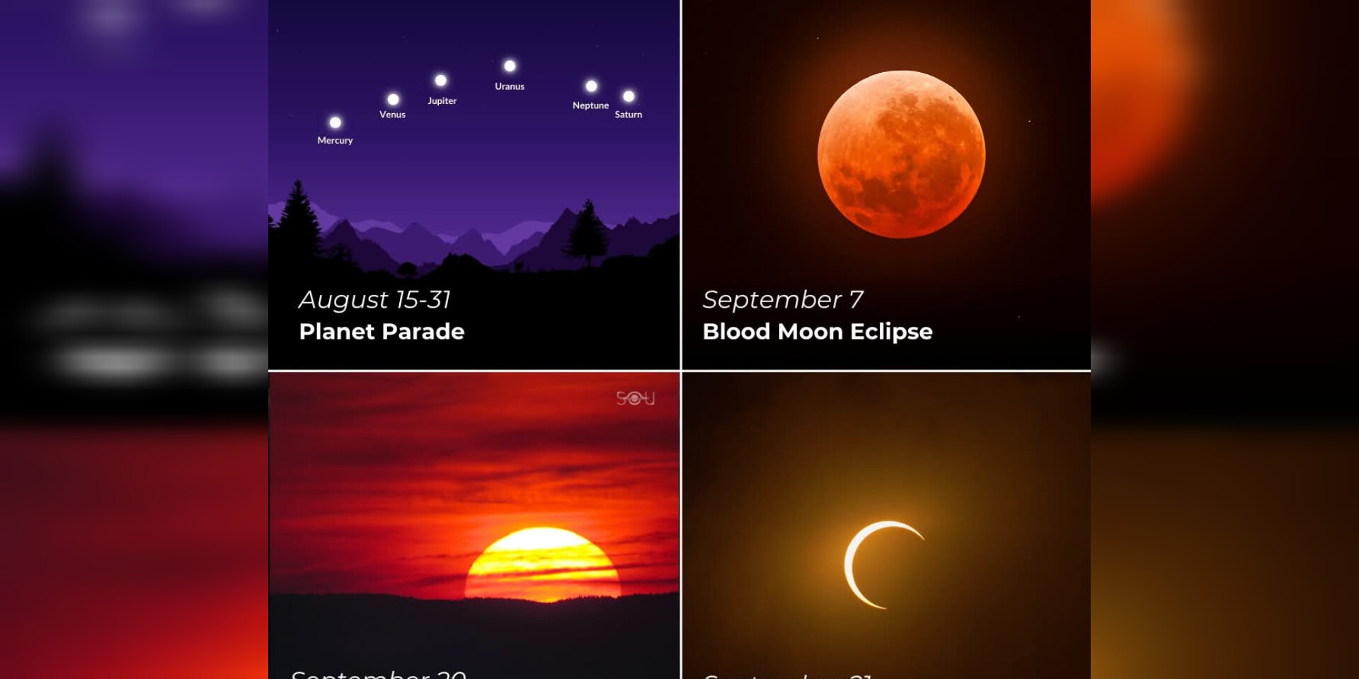ថ្ងៃទី 7 ខែកញ្ញា – សូរ្យគ្រាសនៃព្រះច័ន្ទ សូរ្យគ្រាសសរុបនឹងកើតឡើង ហើយមនុស្សប្រមាណ 7 ពាន់លាននាក់ ឬ 88% នៃចំនួនប្រជាជនពិភព លោកនឹងស្ថិតនៅក្នុងតំបន់ដែលអាចមើលឃើញ។ សូរ្យគ្រាសនេះនឹងអាចមើលឃើញយ៉ាងពេញលេញពីទ្វីបអាហ្រ្វិក អឺរ៉ុប អាស៊ី អូស្ត្រាលី និងផ្នែកខ្លះនៃមហាសមុទ្រប៉ាស៊ីហ្វិកខាងលិច និងកណ្តាល។
