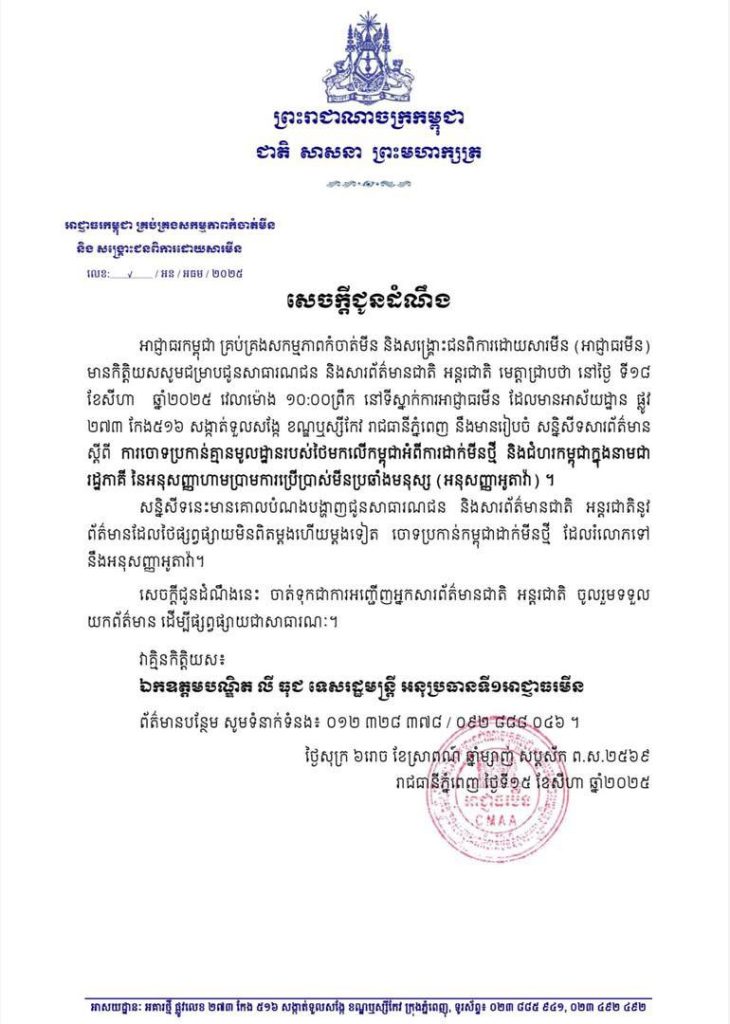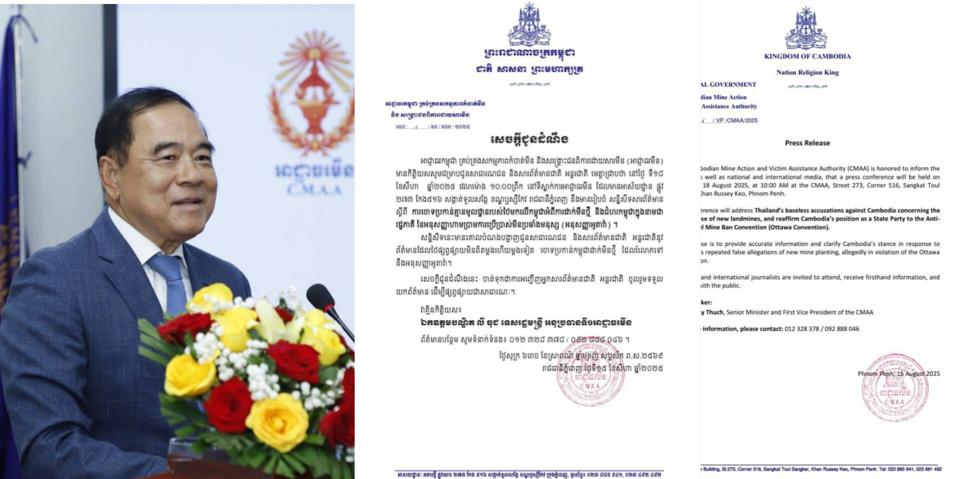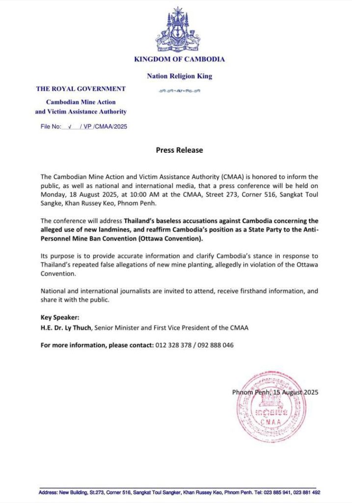 ភ្នំពេញ៖ នៅថ្ងៃទី១៨ ខែសីហា ឆ្នាំ២០២៥ស្អែកនេះ អាជ្ញាធរកម្ពុជាគ្រប់គ្រងសកម្មភាពកំចាត់មីននិងសង្គ្រោះជនពិការដោយសារមីន (អាជ្ញាធរមីន) នឹងមានរៀបចំសន្និសីទសារព័ត៌មានស្តីពី ការចោទប្រកាន់គ្មានមូលដ្ឋានរបស់ថៃមកលើកម្ពុជាអំពីការដាក់មីនថ្មី និងជំហរកម្ពុជាក្នុងនាមជារដ្ឋភាគីនៃអនុសញ្ញាហាមប្រាមការប្រើប្រាស់មីនប្រឆាំងមនុស្ស (អនុសញ្ញាអូតាវ៉ា) នៅទីស្នាក់ការអាជ្ញាធរមីន ដែលមានអាស័យដ្ឋាន ផ្លូវ ២៧៣ កែង៥១៦ សង្កាត់ទួលសង្កែ ខណ្ឌឬស្សីកែវ រាជធានីភ្នំពេញ។