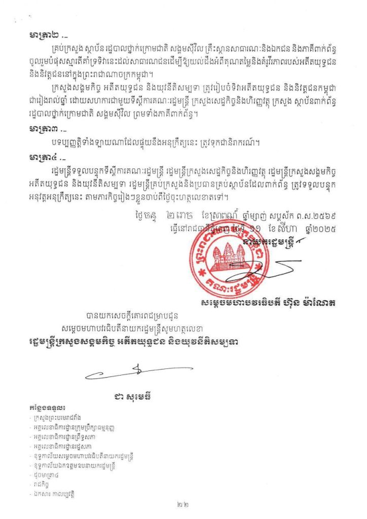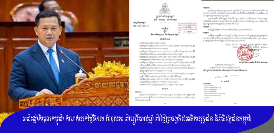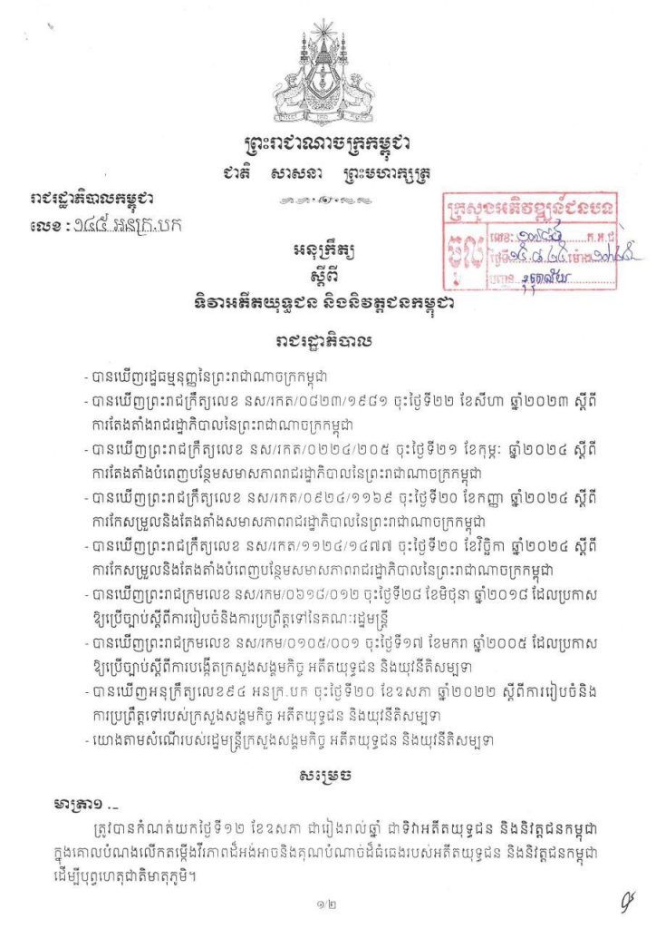 ភ្នំពេញ៖ រាជរដ្ឋាភិបាលកម្ពុជា បានចេញអនុក្រឹត្យ ស្តីពី ទិវាអតីតយុទ្ធជន និងនិវត្តជនកម្ពុជា ដោយបានកំណត់យកថ្ងៃទី១២ ខែឧសភា ជារៀងរាល់ឆ្នាំ ជាថ្ងៃប្រារព្ធទិវាអតីតយុទ្ធជន និងនិវត្តជនកម្ពុជា ក្នុងគោលបំណង លើកតម្កើងវីរភាពដ៏អង់អាចនិងគុណបំណាច់ដ៏ធំធេងរបស់អតីតយុទ្ធជន និងនិវត្តជនកម្ពុជា ដើម្បីបុព្វហេតុជាតិមាតុភូមិ៕
