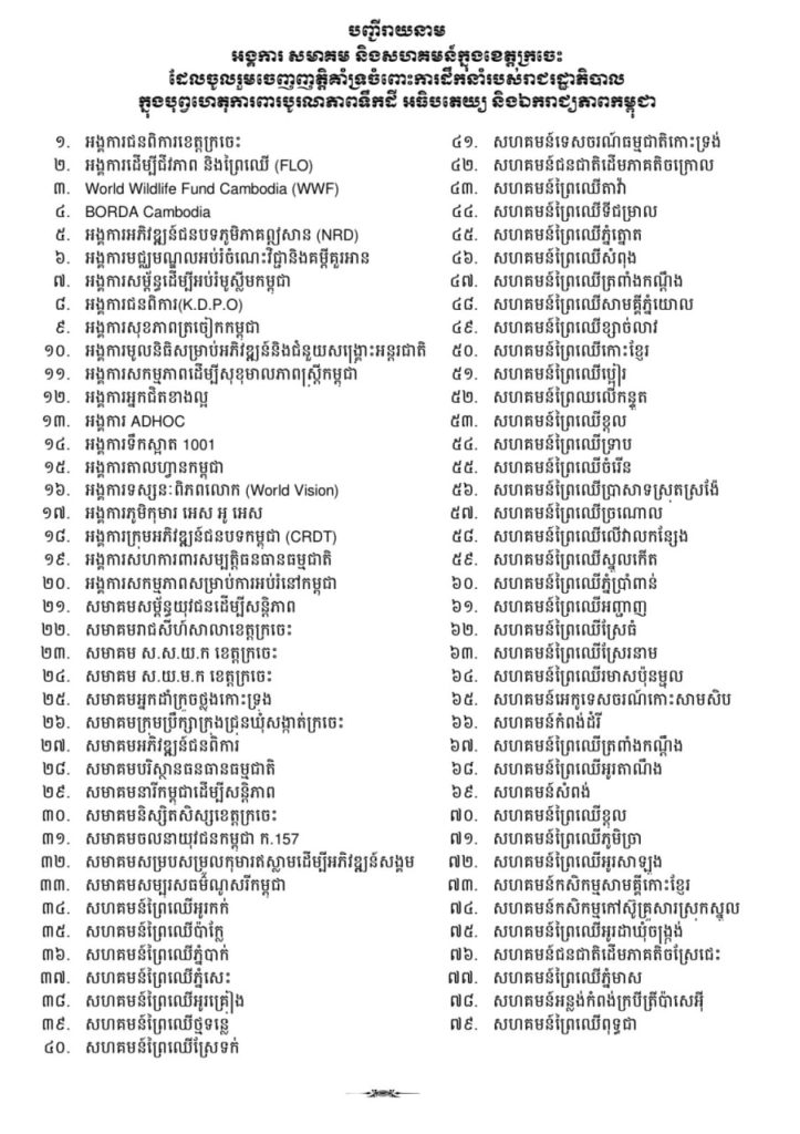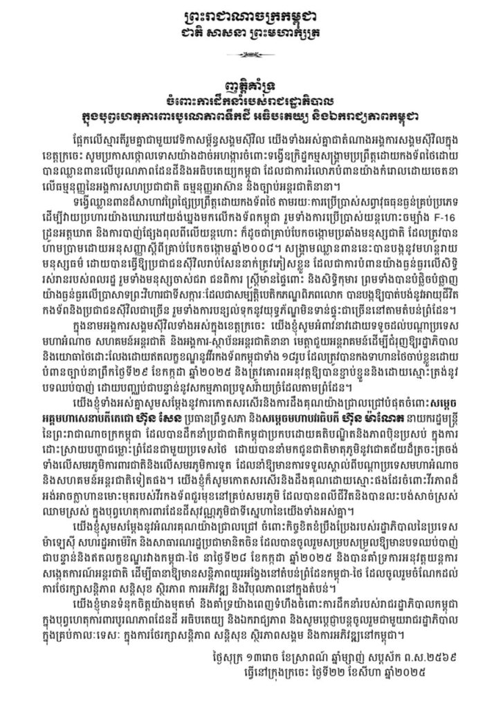 អង្គការសង្គមស៊ីវិលខេត្តក្រចេះបានចេញញត្តិគាំទ្ររាជរដ្ឋាភិបាល ប្តេជ្ញាថែរក្សាសន្តិភាព សន្តិសុខ និងអភិវឌ្ឍន៍ប្រកបដោយចីរភាព និងអំពាវនាវឱ្យសហគមន៍អន្តរជាតិជួយជំរុញឱ្យថៃដោះលែងទាហានកម្ពុជា១៨នាក់ដែលត្រូវបានចាប់ខ្លួនខុសច្បាប់នៅថ្ងៃទី២៩ កក្កដា ២០២៥ និងគោរពបទឈប់បាញ់។