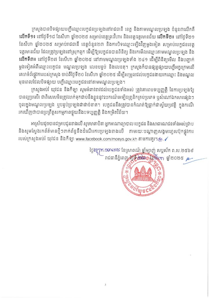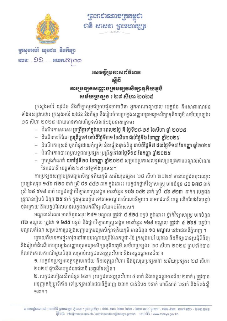 ក្រសួងអប់រំ យុវជន និងកីឡា បានចេញសេចក្តីប្រកាសព័ត៌មាន ស្ដីពីការប្រឡងសញ្ញាបត្រមធ្យមសិក្សាទុតិយភូមិ (បាក់ឌុប) សម័យប្រឡង៖ ២៨ សីហា ២០២៥ ។