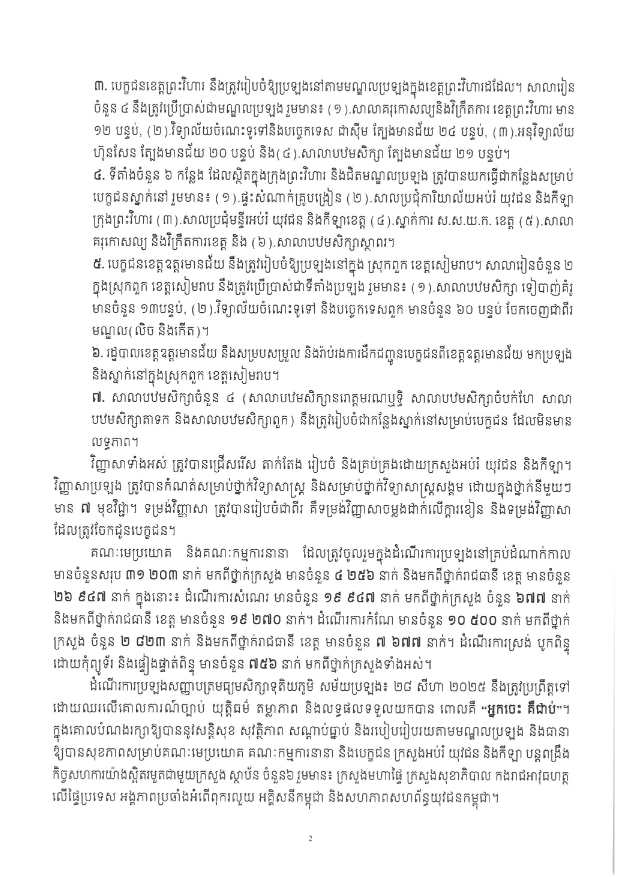 ក្រោយពីមានការផ្ទុះអាវុធនៅតាមបណ្តោយព្រំដែនកម្ពុជា-ថៃ ក្រសួងអប់រំ យុវជន និងកីឡាបានប្រជុំពិនិត្យ និងរៀបចំដំណើរការប្រឡងសញ្ញាបត្រមធ្យមសិក្សាទុតិយភូមិ សម័យប្រឡង៖ ២៨ សីហា ២០២៥ ព្រមទាំងបាន កំណត់គោលការណ៍មួយចំនួន សម្រាប់បេក្ខជនខេត្តព្រះវិហារ និងខេត្តឧត្តរមានជ័យ ៖