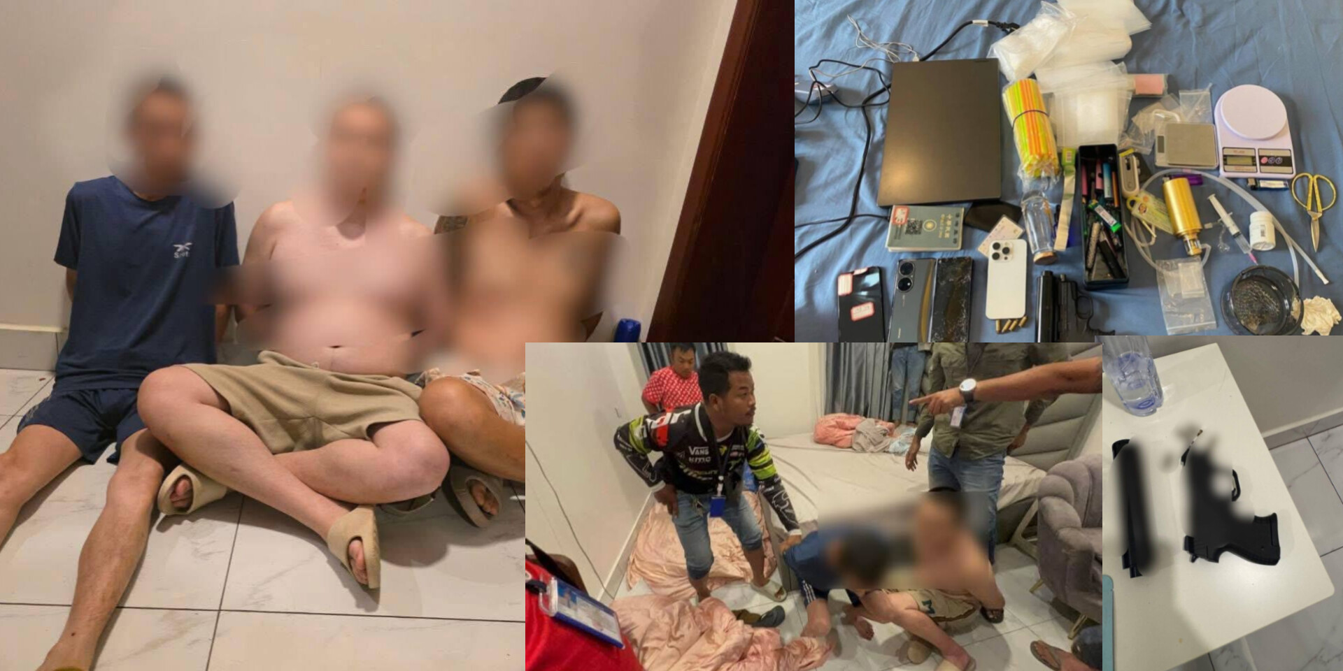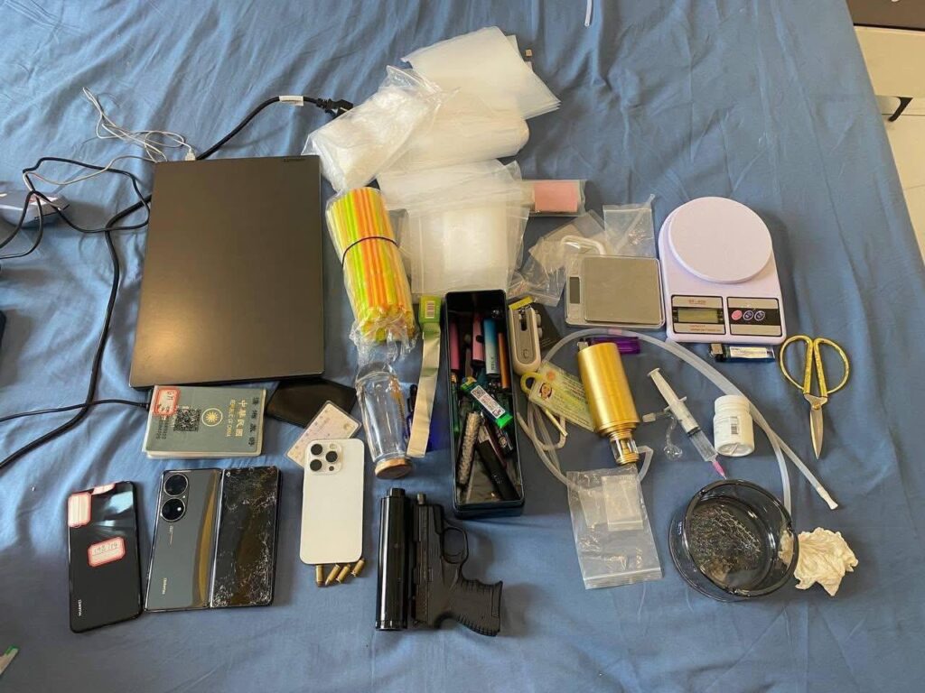 វត្ថុតាងចាប់យក៖ អាវុធខ្លី ០១ដើមម៉ាក ZORAKI M906T លេខ A3YZR17YSO1-2400144 ,បង់ចំនួន ០១ ,គ្រាប់ចំនួន ០៤គ្រាប់ លេខ៣២, ស៊ីឡង់សឺចំនួន ០១,កុំព្យូទ័រលេបថប ចំនួន ០១គ្រឿង ,ទូរស័ព្ទដៃ ចំនួន ០៤គ្រឿង , ជញ្ជីងសម្រាប់ថ្លឹង. ថ្នាំញៀនចំនួន០២ គ្រឿង (តូច ០១,ធំ ០១),លេបថប ចំនួន ០១គ្រឿង ម៉ាកLENOVO ពណ៌ខ្មៅ, ម្សៅក្រាមពណ៌សថ្លាមួយចំនួនតូច ,ឧបករណ៍កែច្នៃសម្រាប់ប្រើប្រាស់គ្រឿងញៀនមួយចំនួន, ឧបករណ៍សម្រាប់ចូកគ្រឿងញៀនចំនួន ០២,PASSPORT ចំនួន ០១,បណ្ណបើកបរចំនួន ០១សន្លឹក,កាតជនជាតិចិនចំនួន ០២សន្លឹក, កាតជនជាតិវៀតណាមចំនួន ០១សន្លឹក,ថង់ប្លាស្ទិចមួយចំនួន បំពង់ទុយោ មួយចំនួន, ដំបងឆក់ចំនួន០២ ខ្នោះចំនួន០២ ស្ព្រាយបាញ់ភ្នែក ចំនួន០៦ កំប៉ុង វិទ្យុទាក់ទងចំនួន០២គ្រឿង ខ្សែរិតពីជ័រ ០១ថង់និងដំបងដែករលាស់០១ផងដែរ។