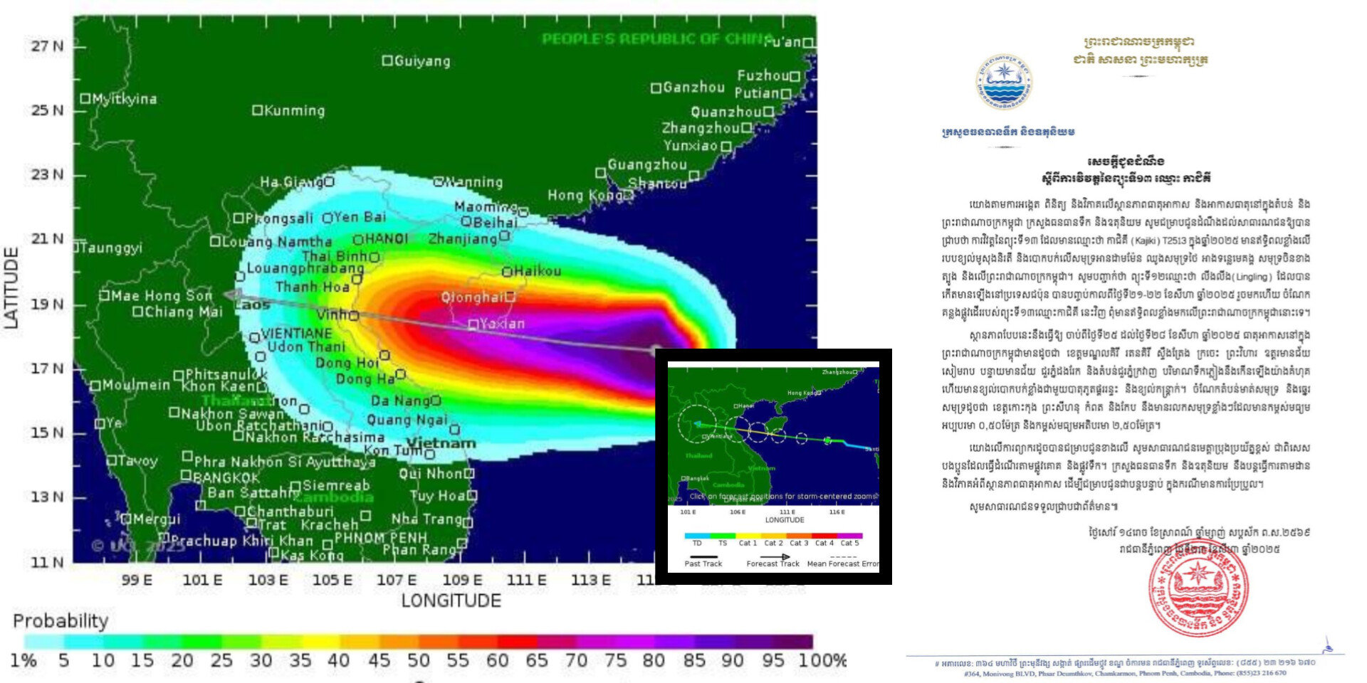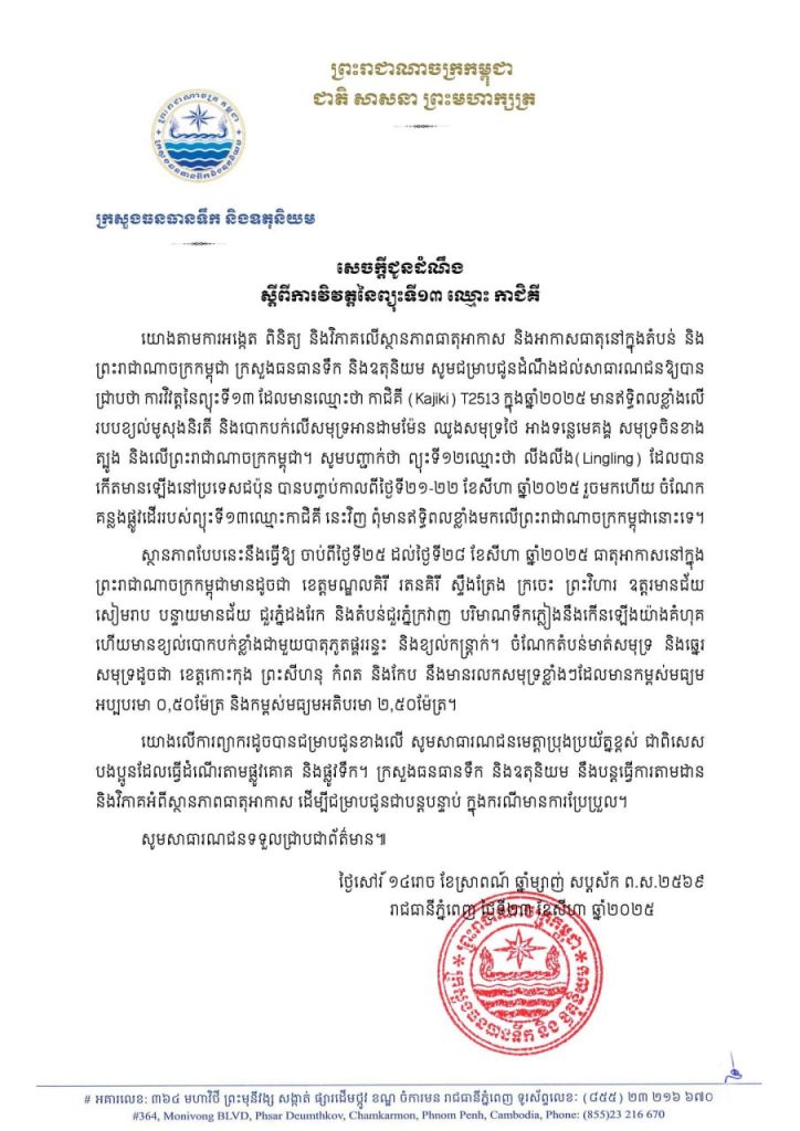 ភ្នំពេញ៖ នៅថ្ងៃទី២៣ ខែសីហា ឆ្នាំ២០២៥ ក្រសួងធនធានទឹក និងឧតុនិយម បានចេញសេចក្តីជូនដំណឹងអំពីការវិវត្តនៃព្យុះទី១៣ ដែលមានឈ្មោះថា កាជិគី (Kajiki) T2513 ក្នុងឆ្នាំ២០២៥ មានឥទ្ធិពលខ្លាំង លើ របបខ្យល់មូសុងនិរតី និងបោកបក់លើសមុទ្រអានដាមម៉ែន ឈូងសមុទ្រថៃ អាងទន្លេមេគង្គ សមុទ្រចិនខាងត្បូង និងលើព្រះរាជាណាចក្រកម្ពុជា។