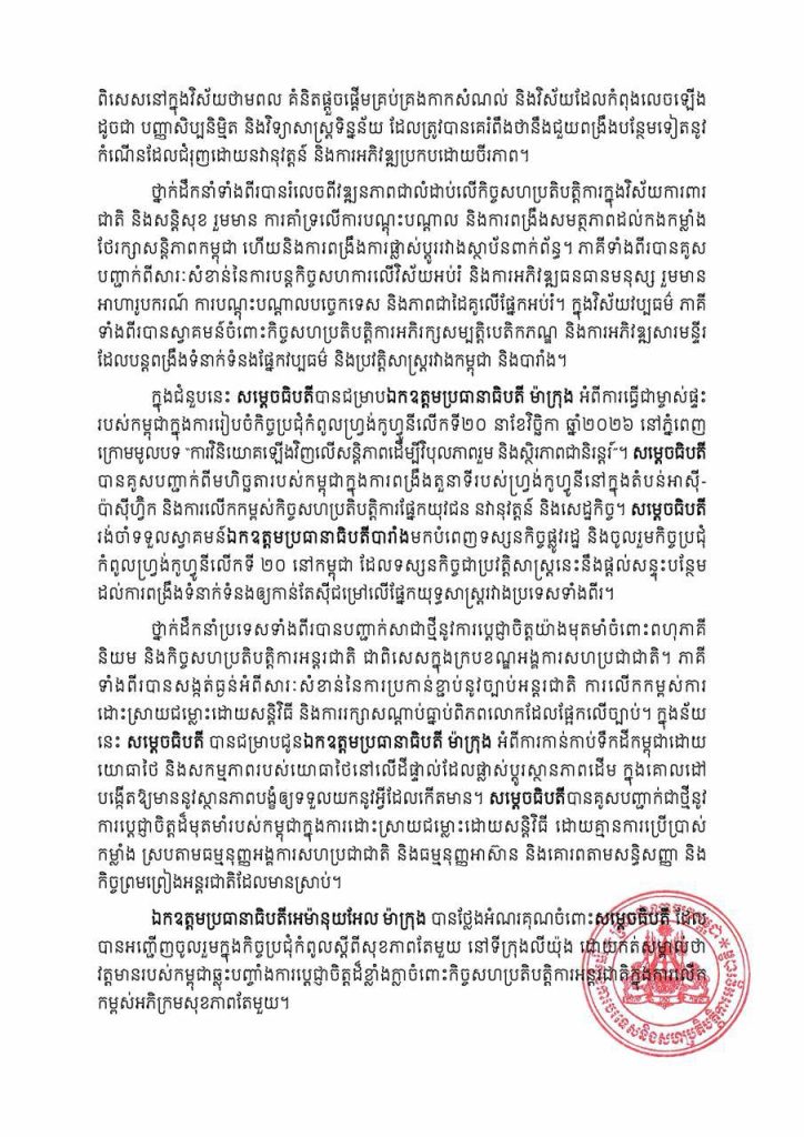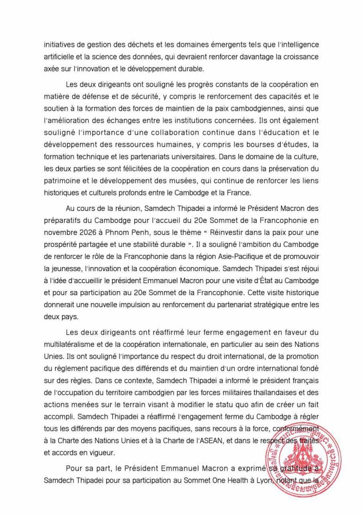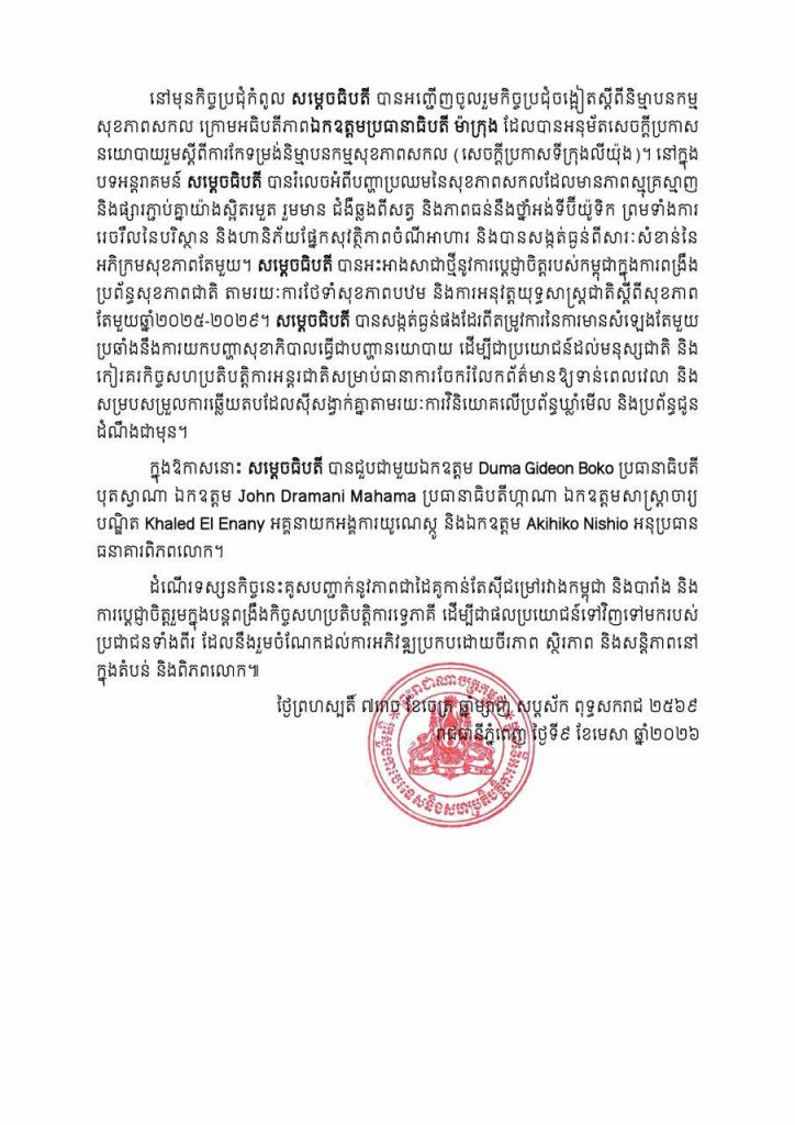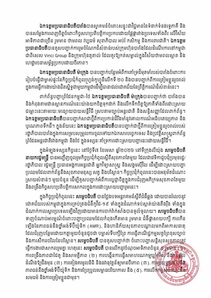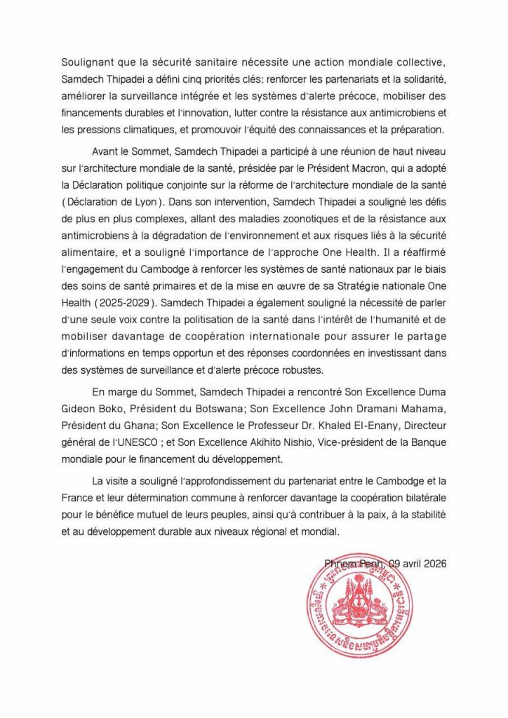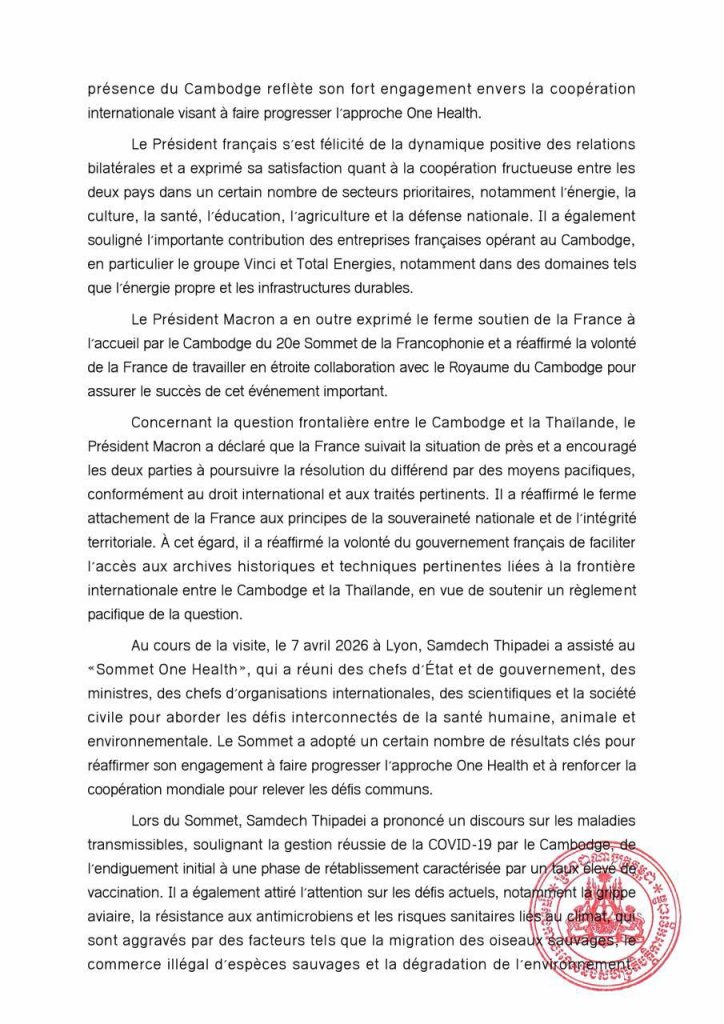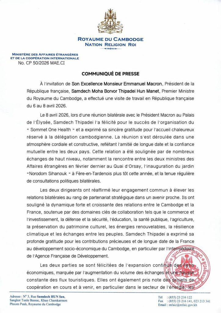 ភ្នំពេញ៖ក្រសួងការបរទេស និងសហប្រតិបត្តិការអន្តរជាតិ នៅថ្ងៃទី៩ ខែមេសា ឆ្នាំ២០២៦ បានចេញសេចក្ដីប្រកាសព័ត៌មានអំពីលទ្ធផលដំណើរទស្សនកិច្ចរបស់សម្ដេចនាយករដ្ឋមន្ត្រីកម្ពុជា ទៅកាន់សាធារណរដ្ឋបារាំង ចាប់ពីថ្ងៃទី៦-៩ ខែមេសា ឆ្នាំ២០២៦កន្លងទៅ៕